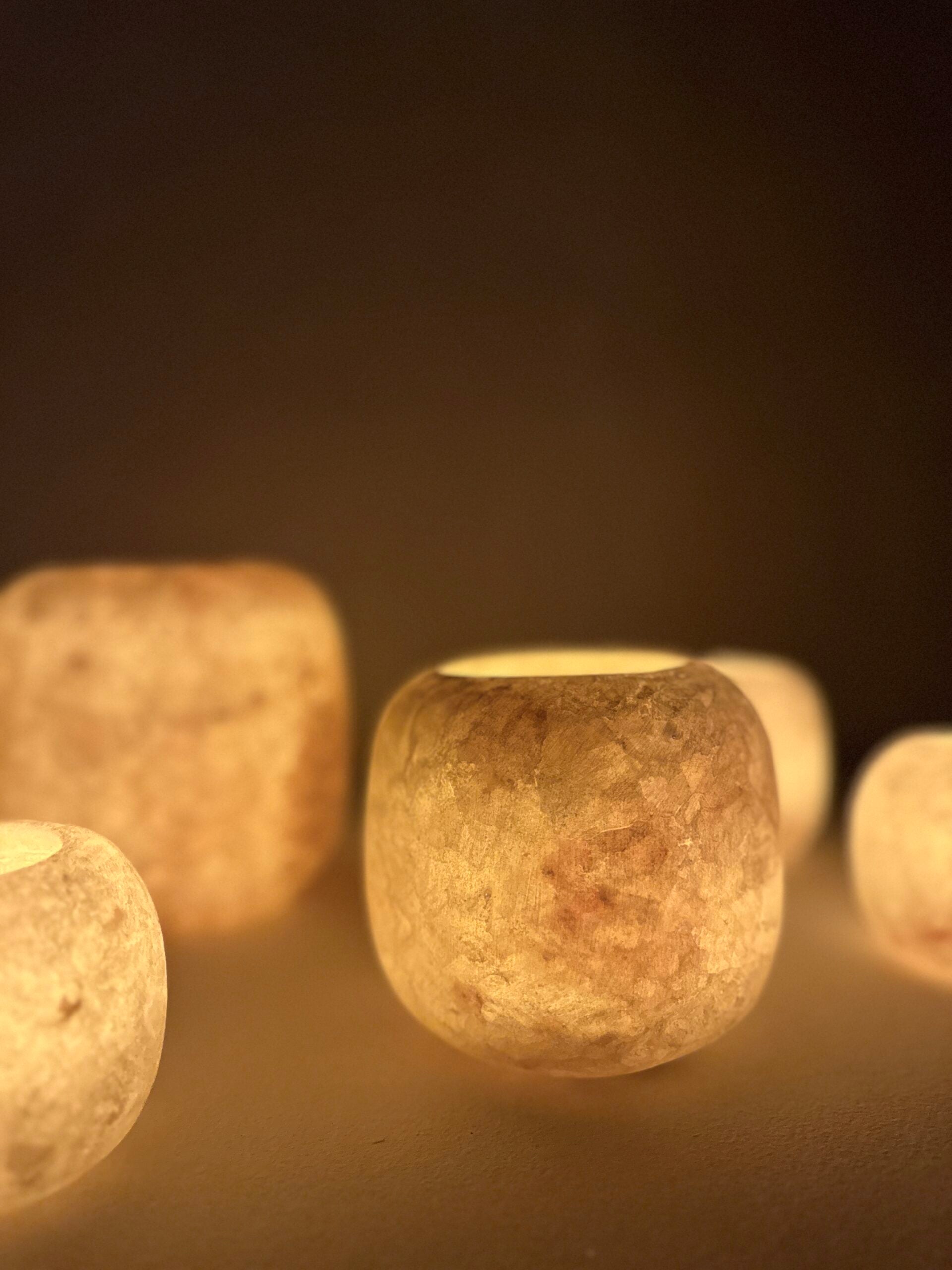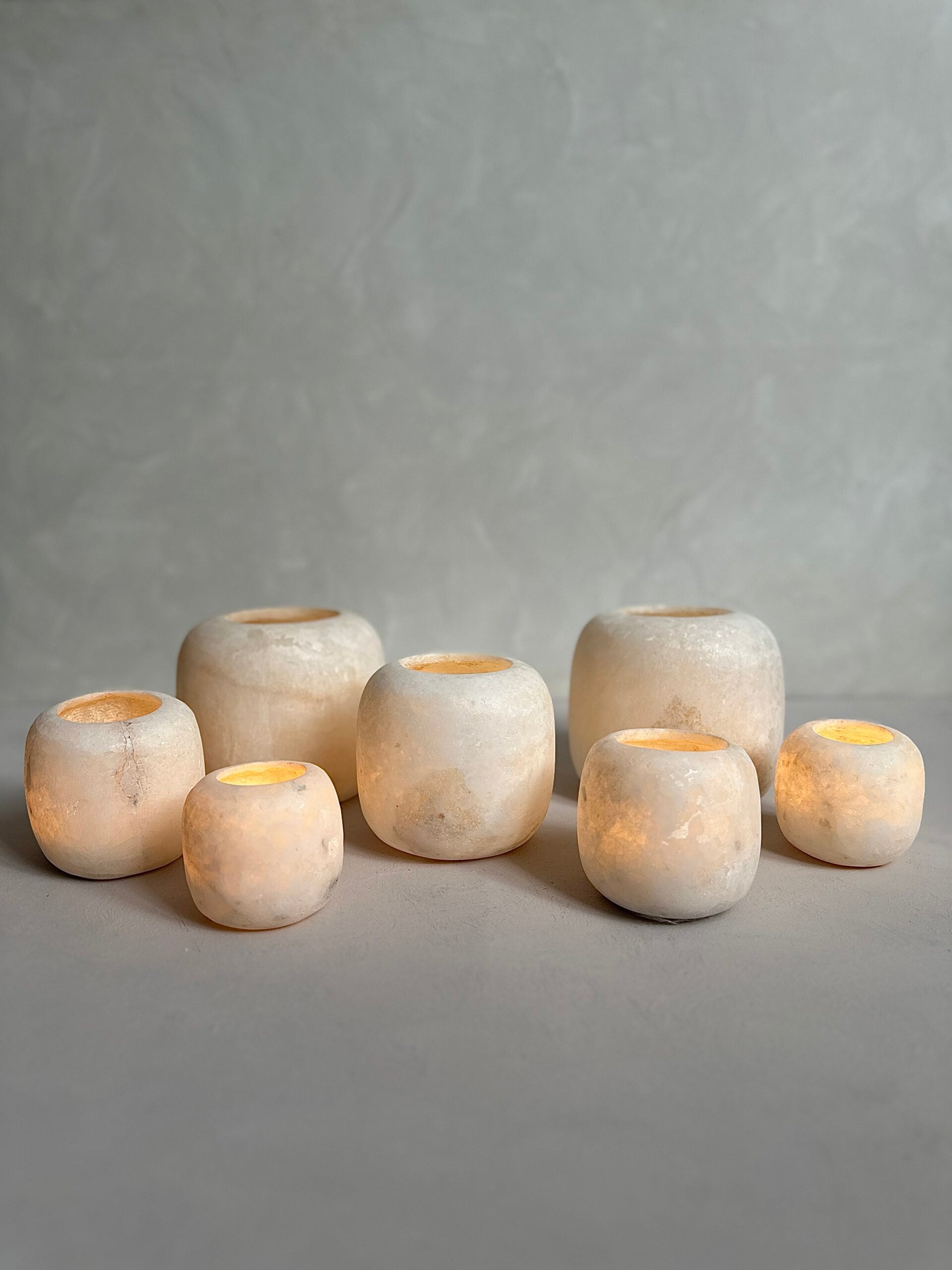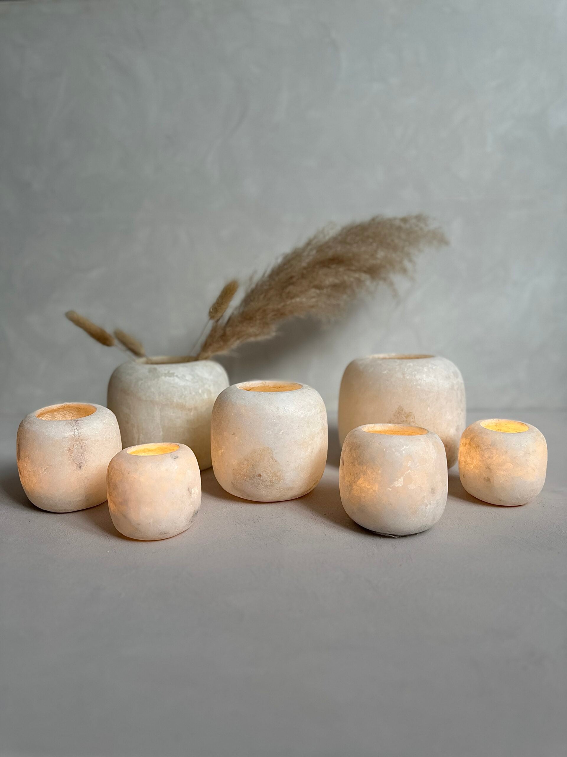 Jeder Kerzenhalter ist aus natürlichem ägyptischem Alabaster gefertigt und hat seinen ganz eigenen Charakter. Die sanften Elfenbeintöne und die zarte Maserung variieren von Stück zu Stück und machen jedes Exemplar zu einem echten Unikat.