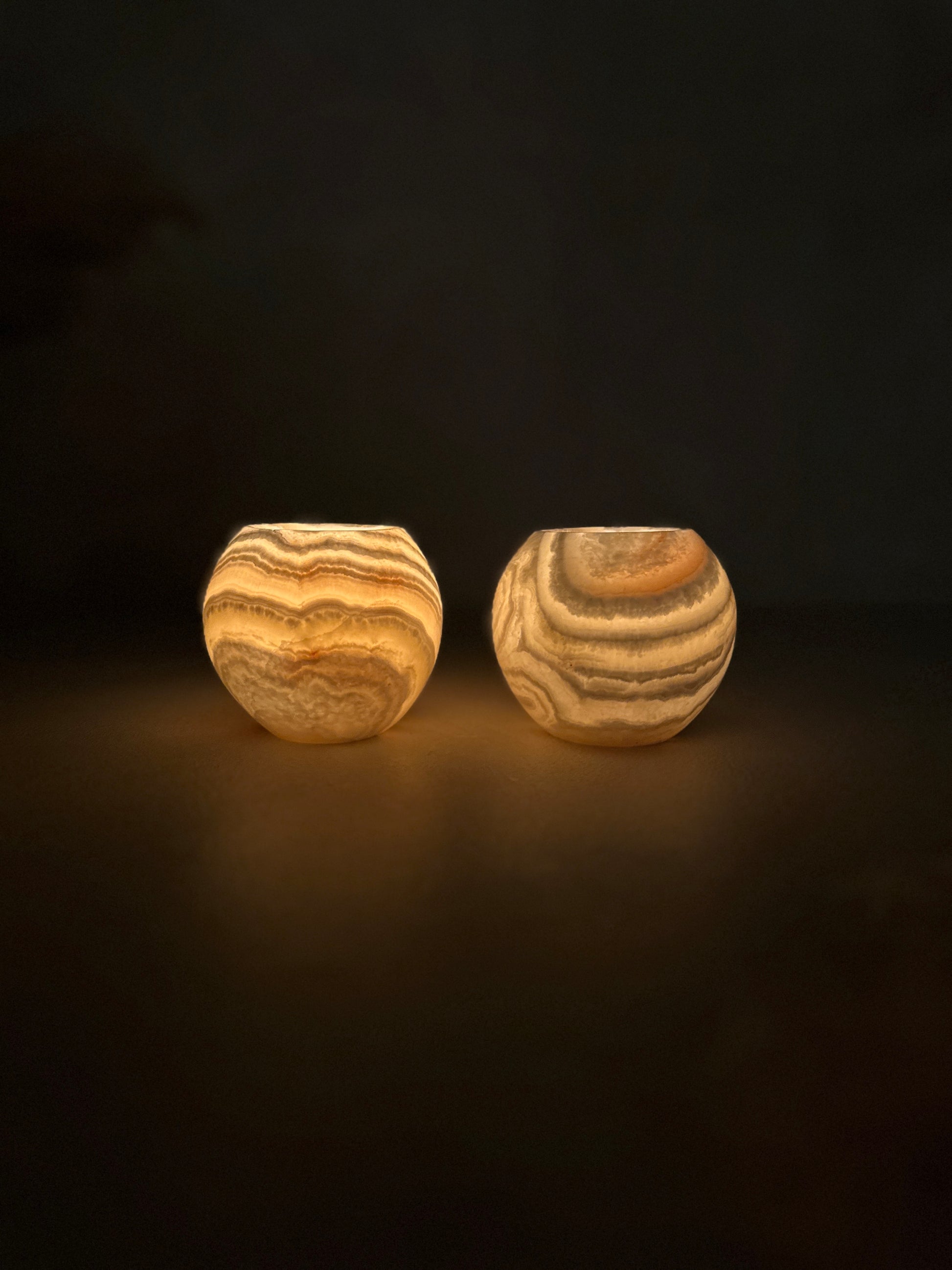 Dieses Set aus natürlichem ägyptischem Alabaster ist das perfekte Paar! Die einzigartige Maserung und die natürlichen Variationen im Stein erzeugen in jedem Stück ein einzigartiges Muster, sodass keine zwei Stücke genau gleich sind.