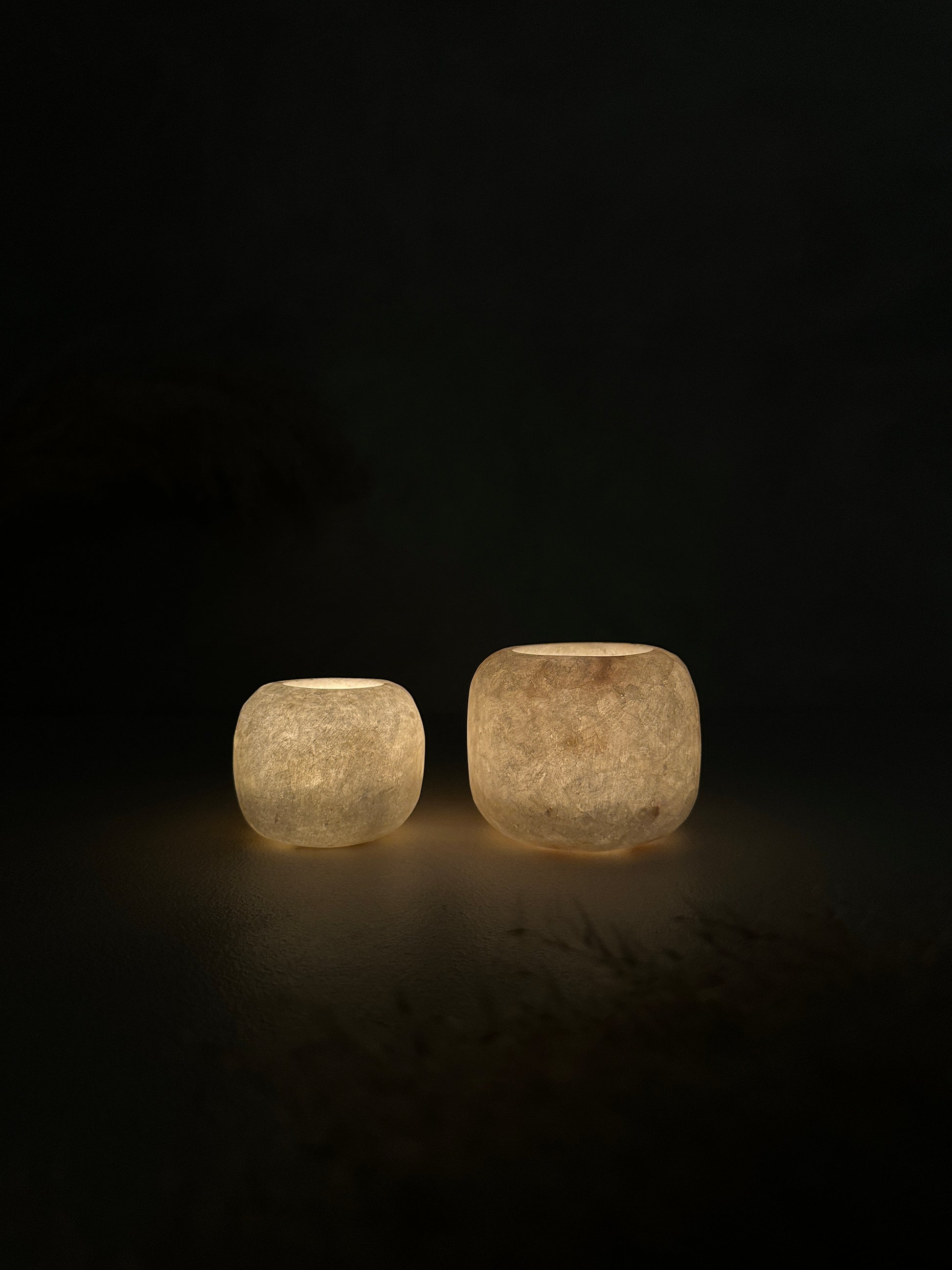 Jeder Kerzenhalter ist aus natürlichem ägyptischem Alabaster gefertigt und hat seinen eigenen, einzigartigen Charakter. Die sanften Elfenbeintöne und feinen Adern variieren von Stück zu Stück, wodurch jeder Kerzenhalter wirklich einzigartig ist.