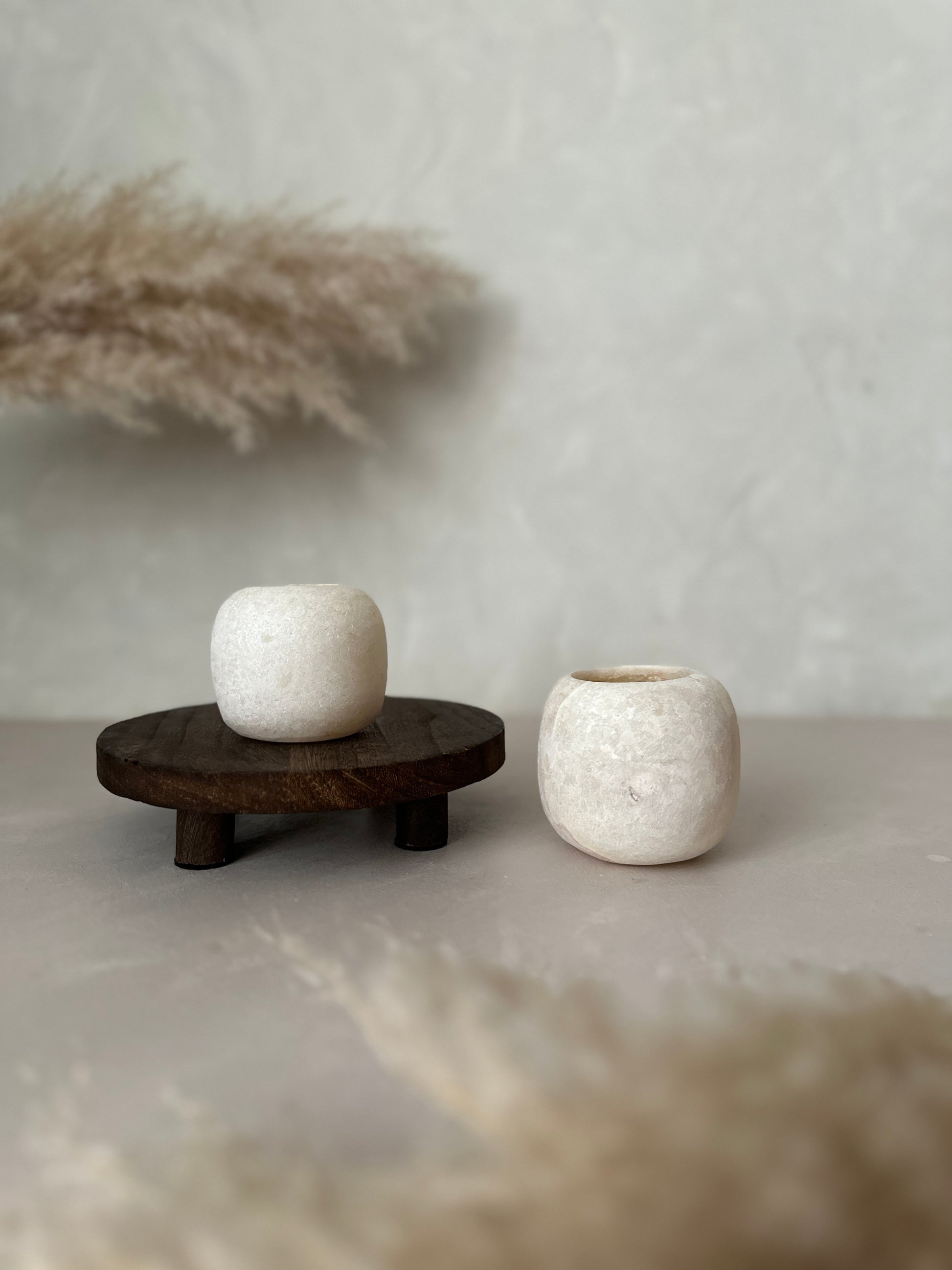 Jeder Kerzenhalter ist aus natürlichem ägyptischem Alabaster gefertigt und hat seinen eigenen, einzigartigen Charakter. Die sanften Elfenbeintöne und feinen Adern variieren von Stück zu Stück, wodurch jeder Kerzenhalter wirklich einzigartig ist.