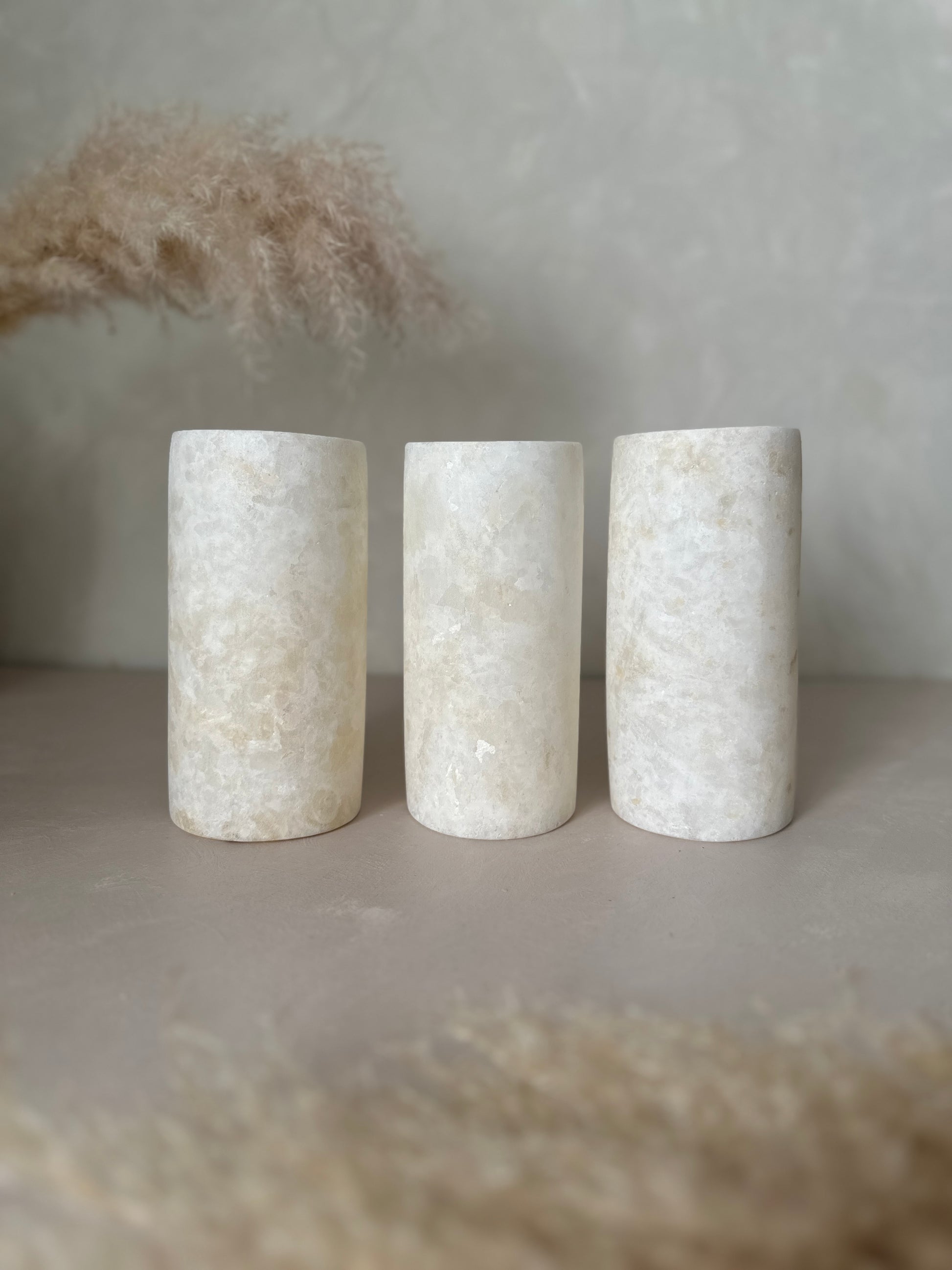 Jeder Kerzenhalter ist aus natürlichem ägyptischem Alabaster gefertigt und hat seinen eigenen, einzigartigen Charakter. Die sanften Elfenbeintöne und feinen Adern variieren von Stück zu Stück, wodurch jeder Kerzenhalter wirklich einzigartig ist.