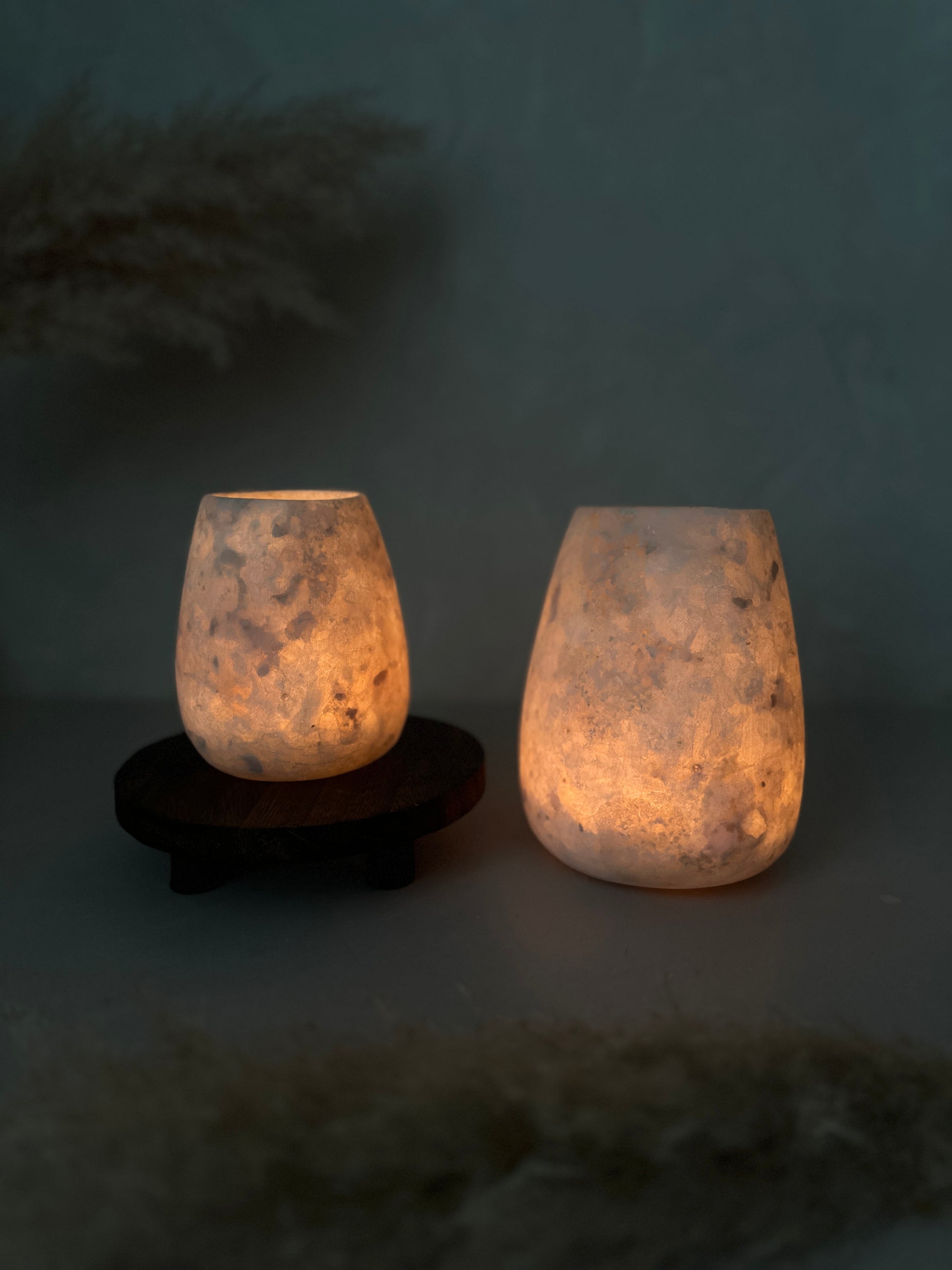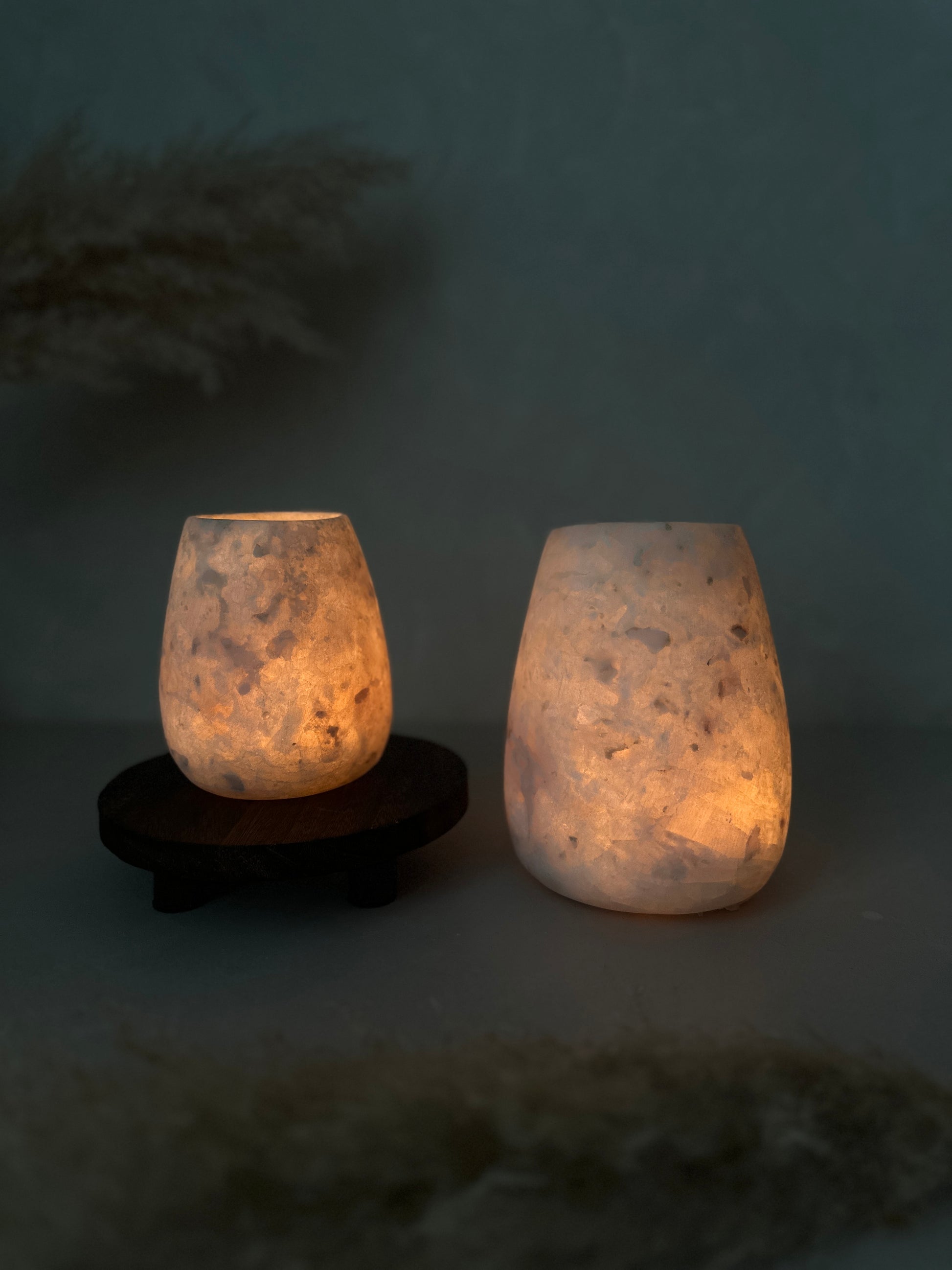 Jeder Kerzenhalter ist aus natürlichem ägyptischem Alabaster gefertigt und hat seinen eigenen, einzigartigen Charakter. Die sanften Elfenbeintöne und feinen Adern variieren von Stück zu Stück, wodurch jeder Kerzenhalter wirklich einzigartig ist.
