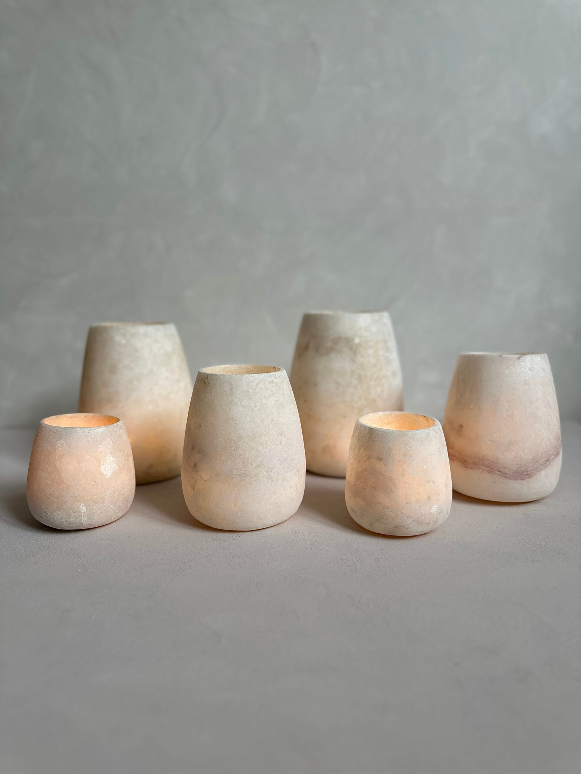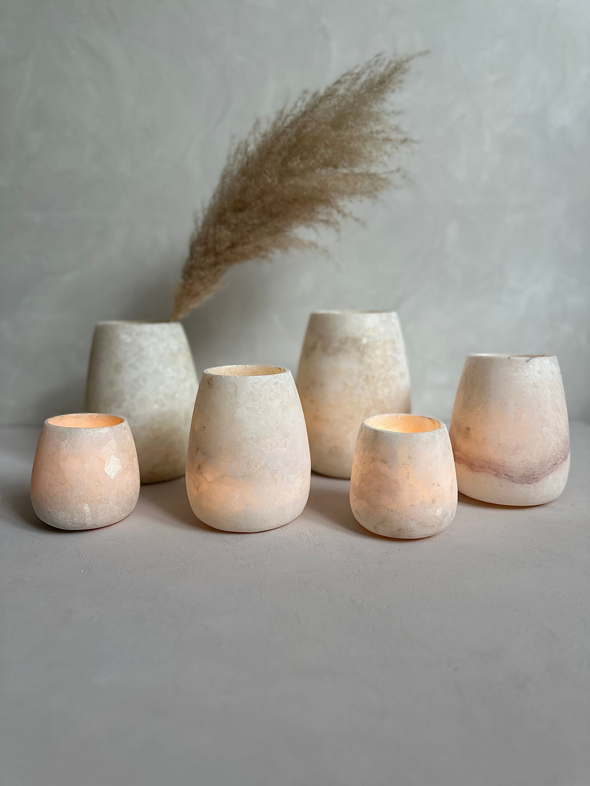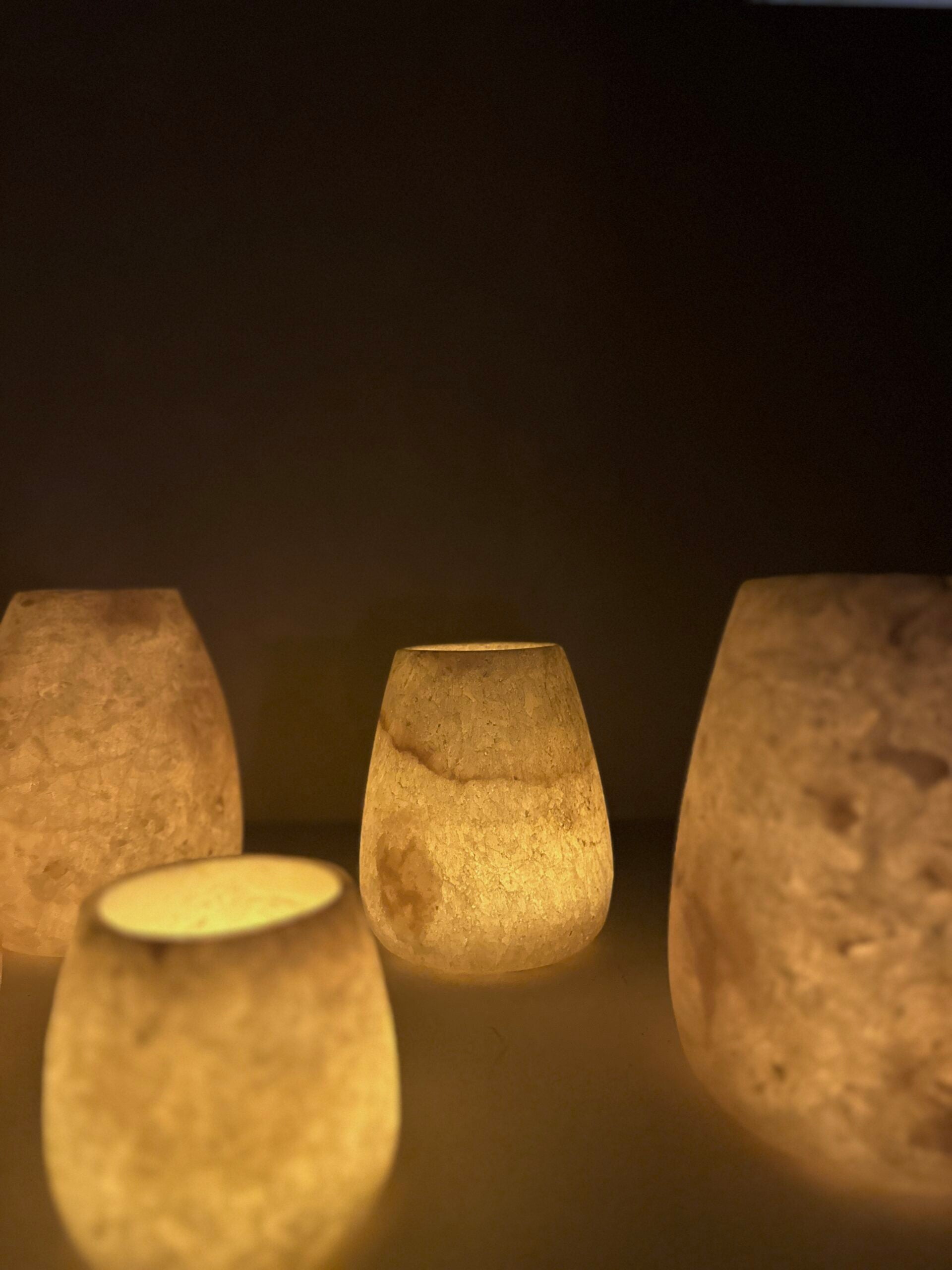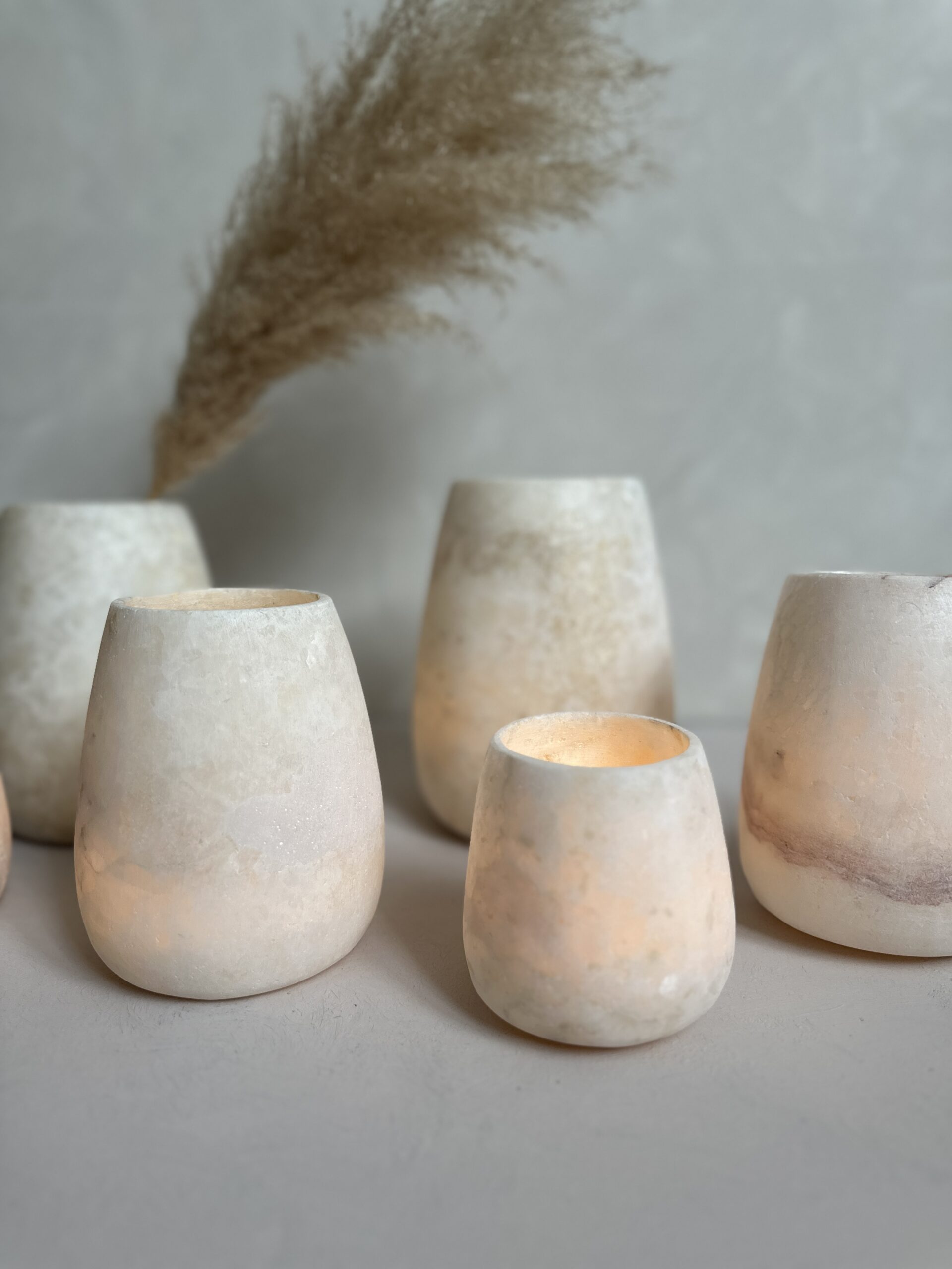 Jeder Kerzenhalter ist aus natürlichem ägyptischem Alabaster gefertigt und hat seinen ganz eigenen Charakter. Die sanften Elfenbeintöne und die zarte Maserung variieren von Stück zu Stück und machen jedes Exemplar zu einem echten Unikat.