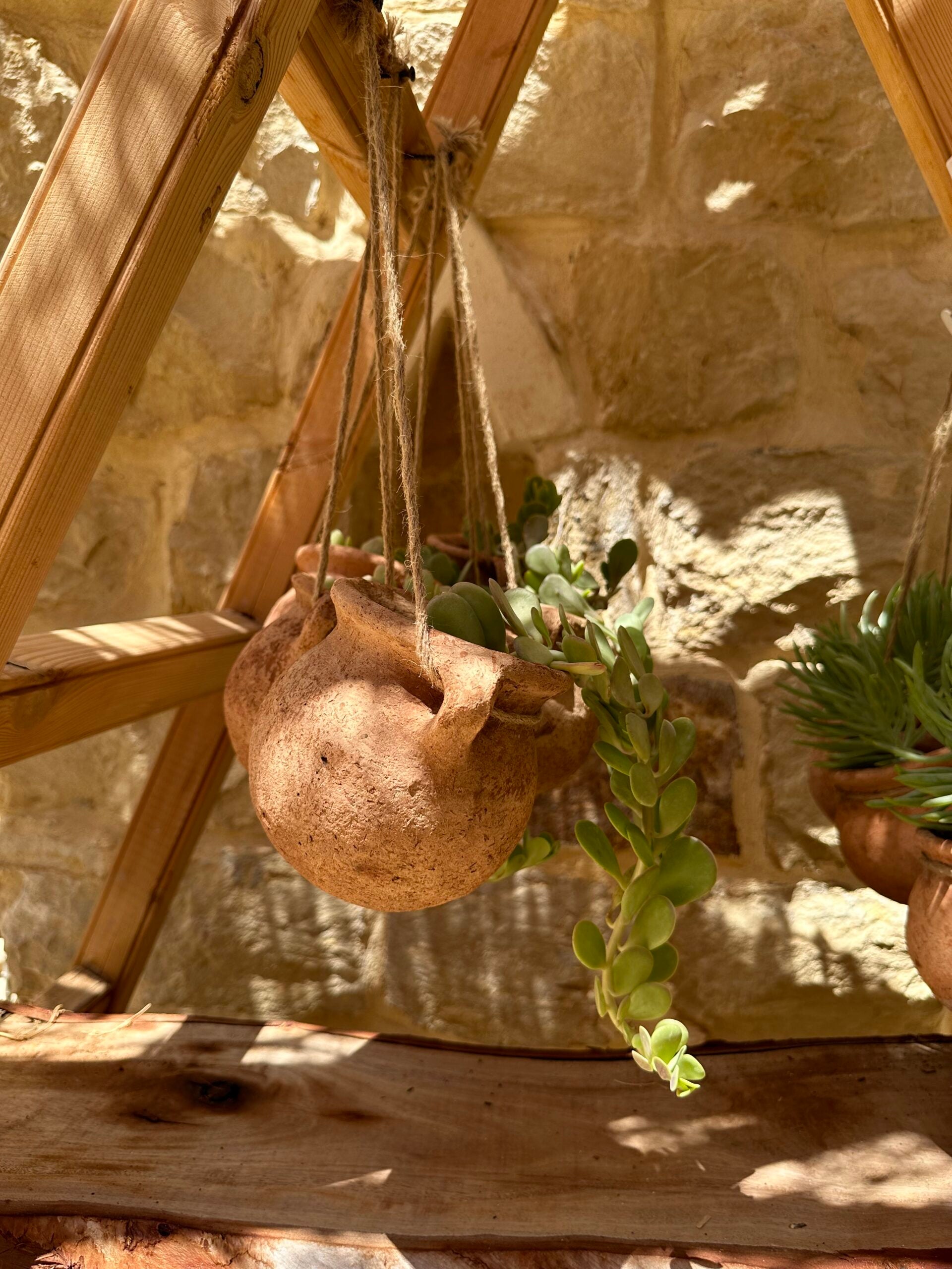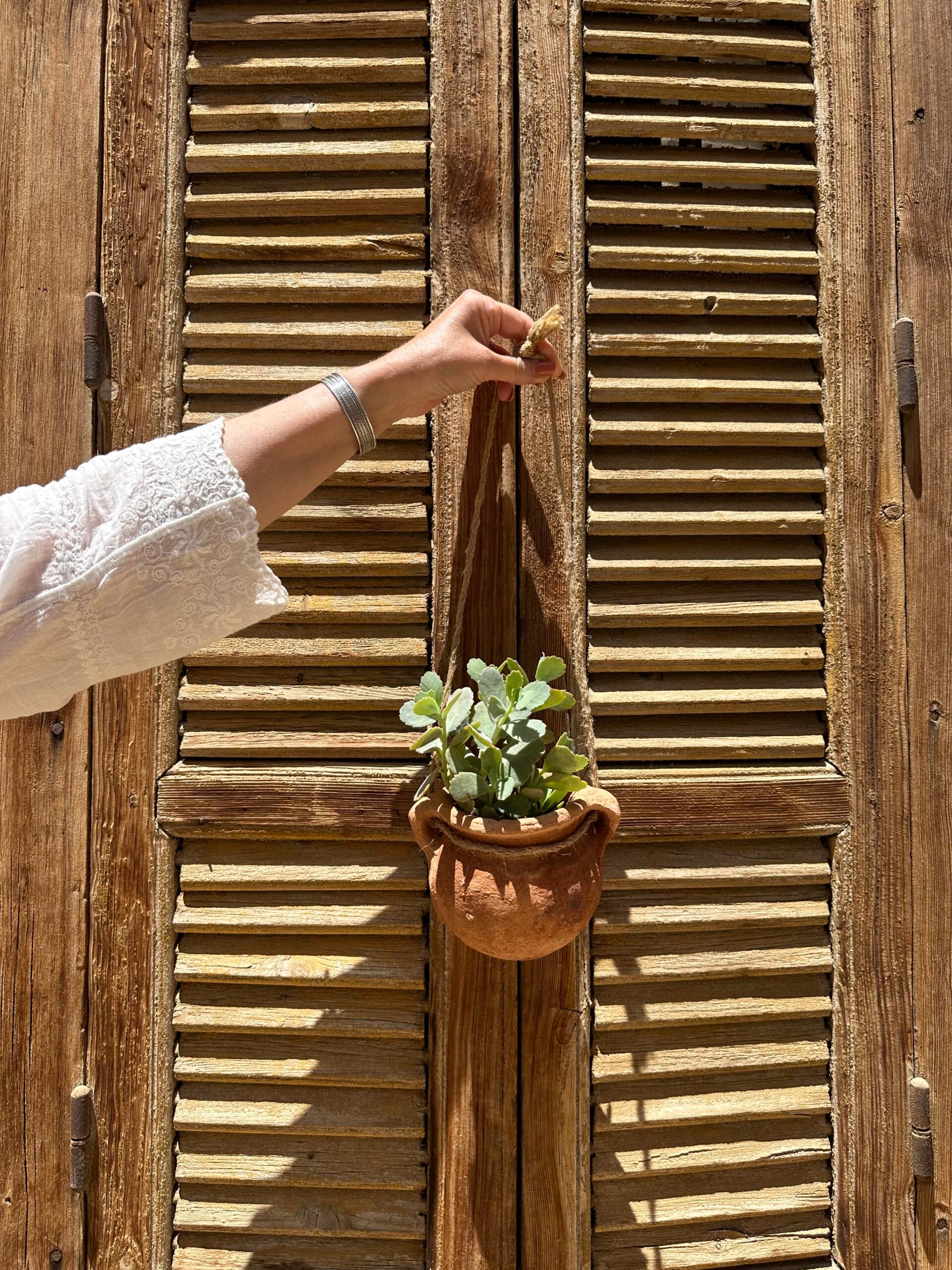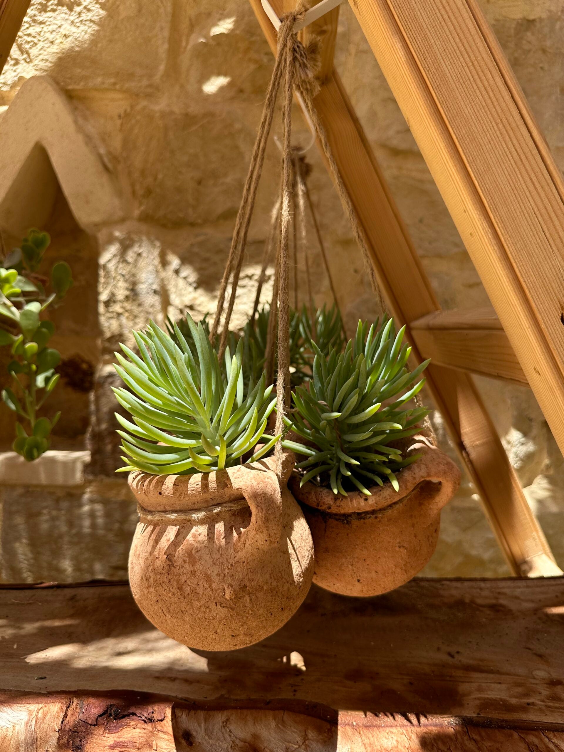 Wir präsentieren unseren Terrakotta-Hänger – Gefertigt aus hochwertiger Terrakotta, zeigt dieser Hänger die Schönheit der Schlichtheit. Der erdige, rustikale Charme von Terrakotta harmoniert mit verschiedenen Einrichtungsstilen. Er ist ein vielseitiges Dekorationsstück, das in verschiedenen Umgebungen eingesetzt werden kann, von Küchen und Wohnzimmern bis hin zu Balkonen und Gärten. Dank seiner geringen Größe eignet er sich perfekt, um Ihre Lieblingspflanzen oder Sukkulenten in Szene zu setzen und Ihrem Zuhause einen Hauch von Grün zu verleihen. Bitte beachten Sie kleine Größenunterschiede und Unvollkommenheiten. Jedes Stück ist komplett handgefertigt und ein Unikat.