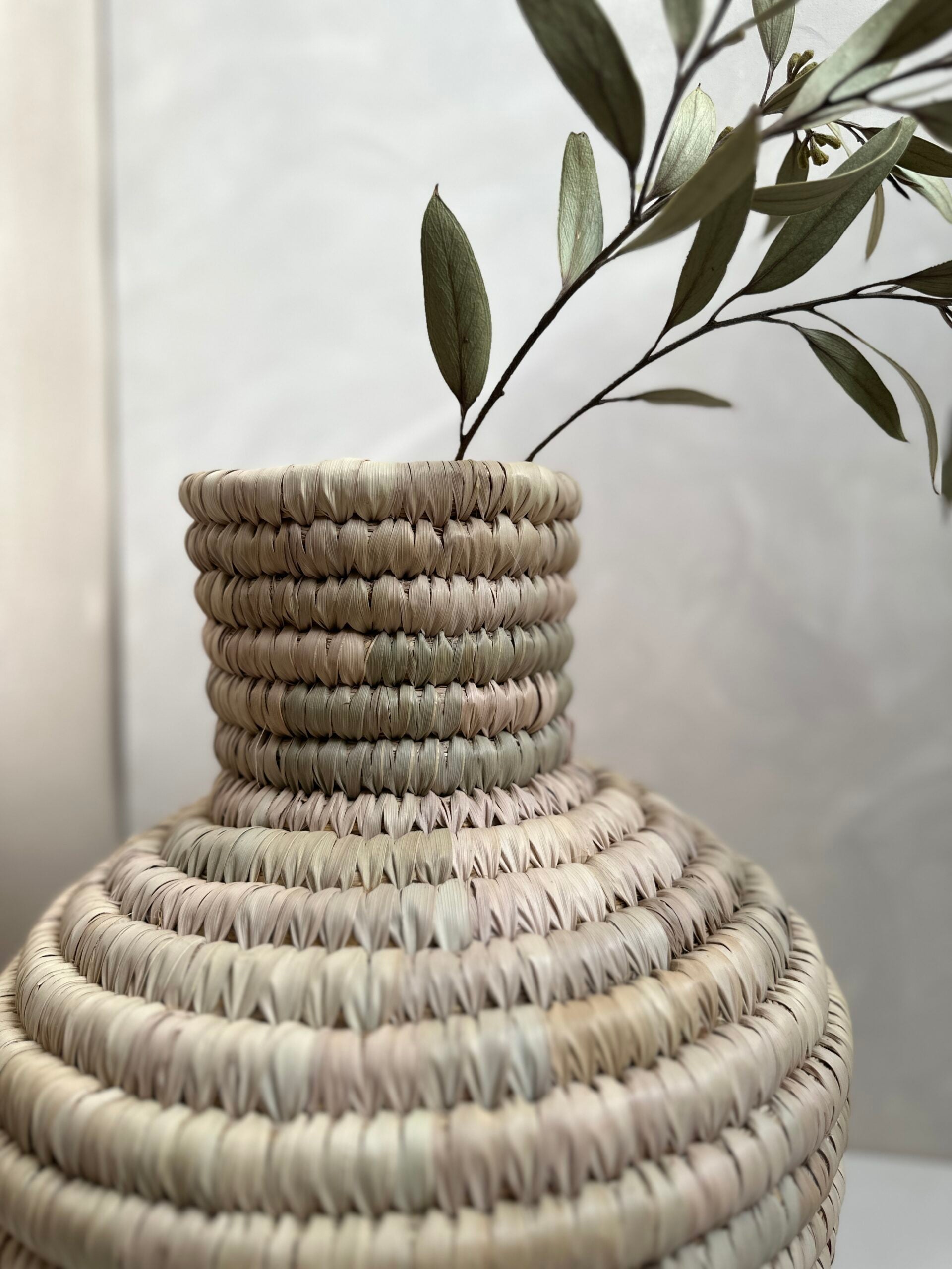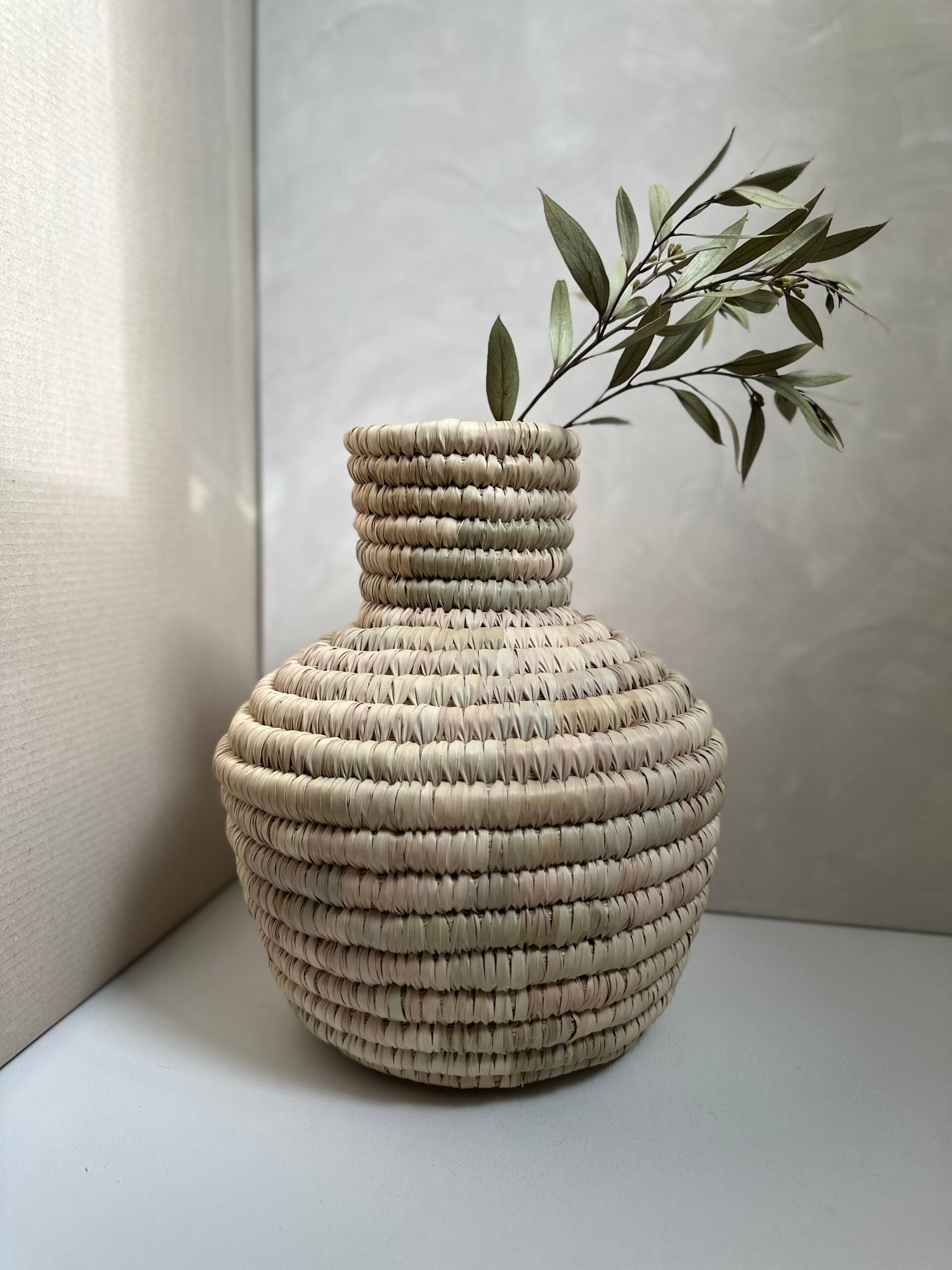 Unsere Vase „Menu“ wird kunstvoll aus Palmblättern geflochten, was ihr einen einzigartigen, erdigen Charme verleiht. Sie ist eine nachhaltige und umweltfreundliche Wahl, die jedem Raum eine rustikale und entspannte Atmosphäre verleiht. Kombinieren Sie unsere kleine und mittlere Vase zu einem perfekten Paar. Jedes Stück ist handgefertigt und ein Unikat. Bitte beachten Sie geringfügige Größenabweichungen und leichte Unvollkommenheiten.Aktie