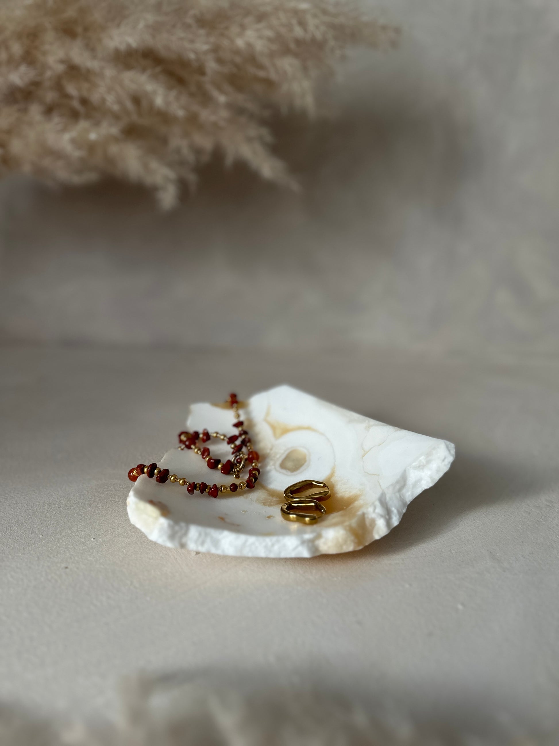 Dit unieke stuk is gemaakt van restjes albast, waardoor elk fragment een kleine treasure is geworden. Elk object heeft natuurlijke breuken, onregelmatige randen en subtiele kleurvariaties, waardoor elk stuk werkelijk uniek is.
