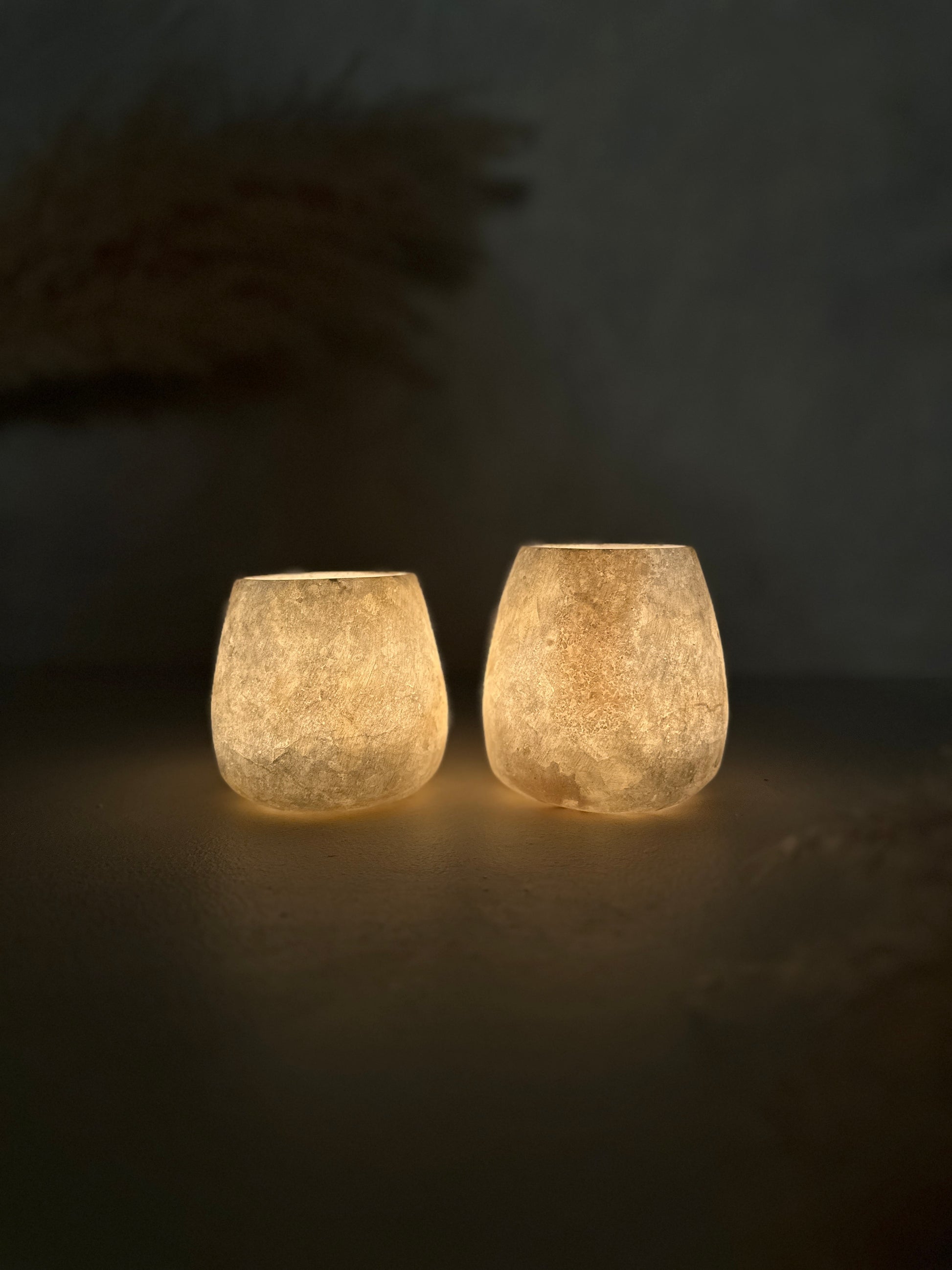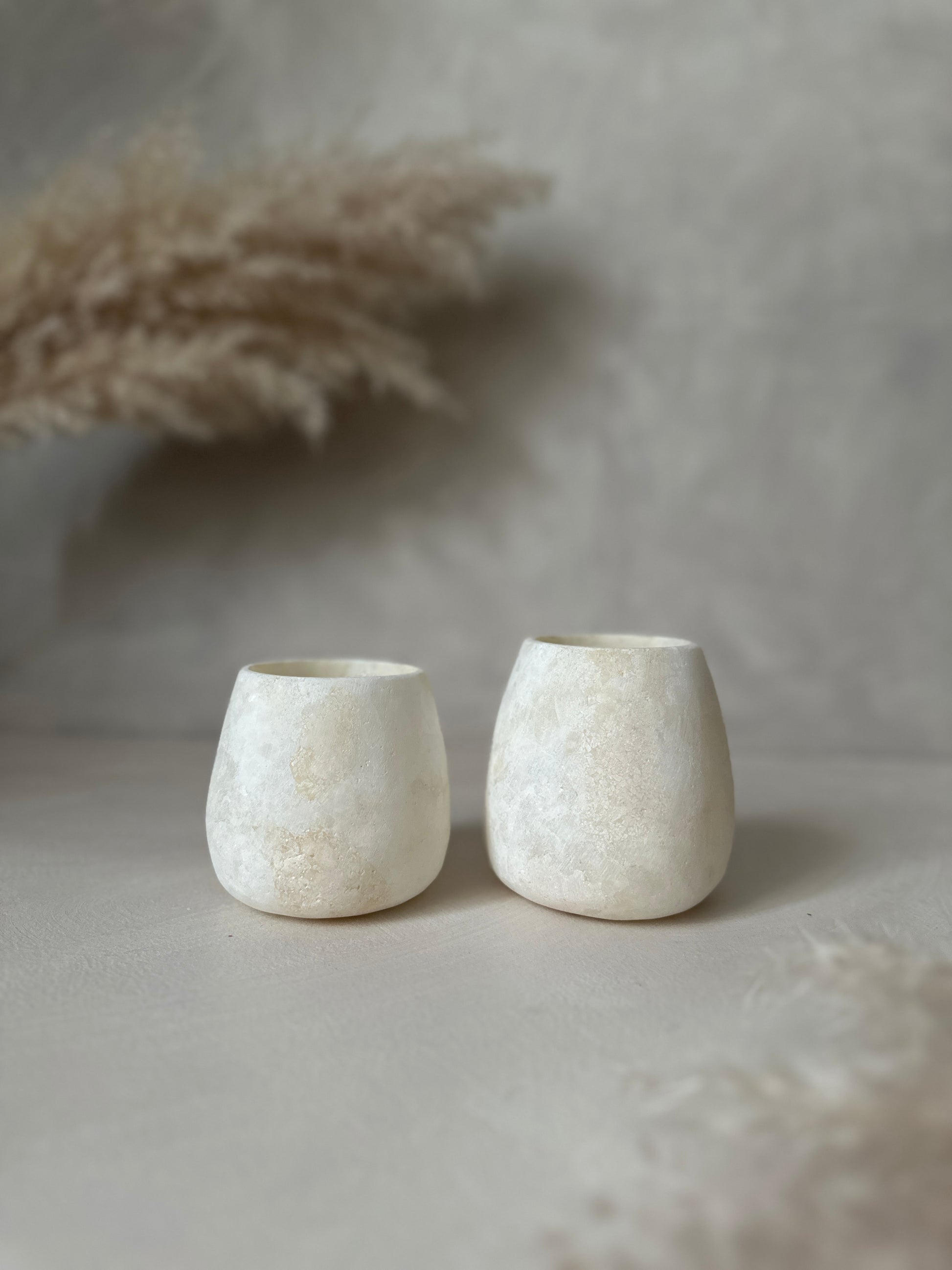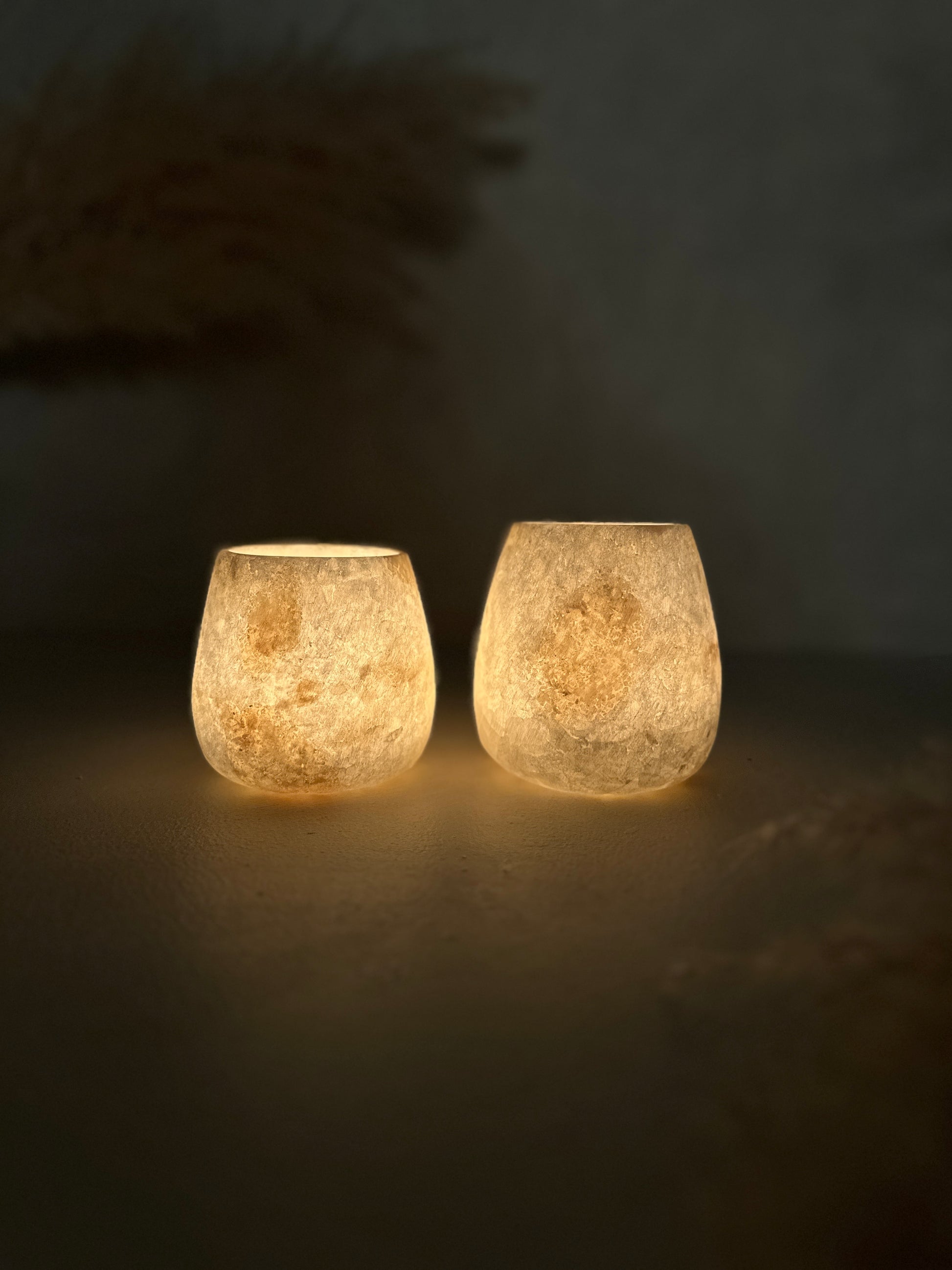 Elke kandelaar is vervaardigd uit natuurlijk Egyptisch albast en heeft daardoor een eigen, uniek karakter. De zachte ivoorkleuren en delicate nerven variëren van stuk tot stuk, waardoor elk exemplaar werkelijk uniek is.