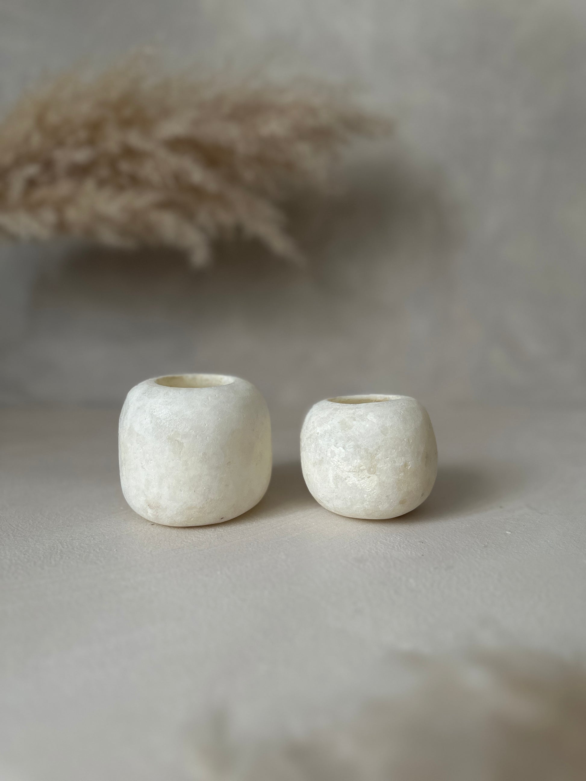 Elke kandelaar is vervaardigd uit natuurlijk Egyptisch albast en heeft daardoor een eigen, uniek karakter. De zachte ivoorkleuren en delicate nerven variëren van stuk tot stuk, waardoor elk exemplaar werkelijk uniek is.