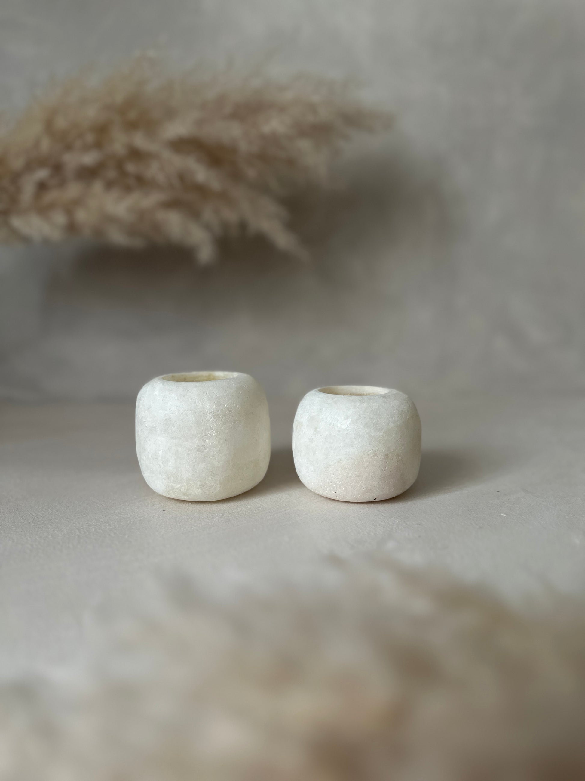 Elke kandelaar is vervaardigd uit natuurlijk Egyptisch albast en heeft daardoor een eigen, uniek karakter. De zachte ivoorkleuren en delicate nerven variëren van stuk tot stuk, waardoor elk exemplaar werkelijk uniek is.