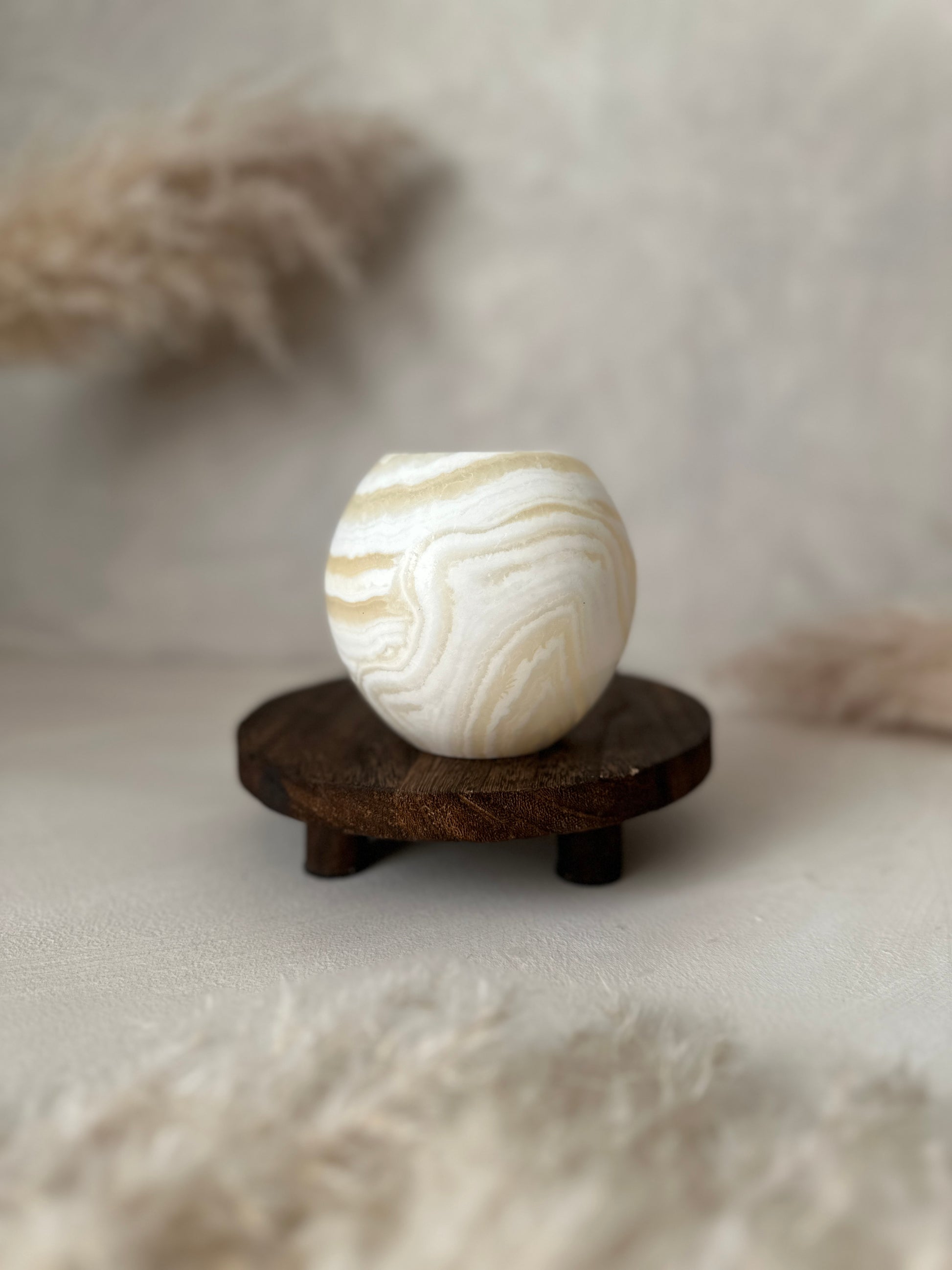 Carved from natural Egyptian Alabaster, these candleholders are truly one-of-a-kind. Unlike our White Alabaster collection, each piece has its own unique pattern, colors, and markings. Some feature stripes, some blends of warm tones, and some are mostly white. No two stones are exactly alike, making each candleholder a distinctive, artisanal piece.