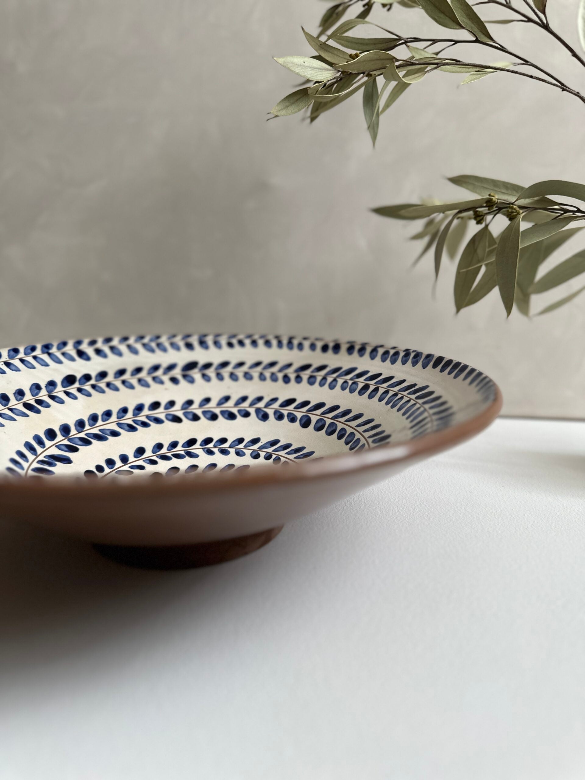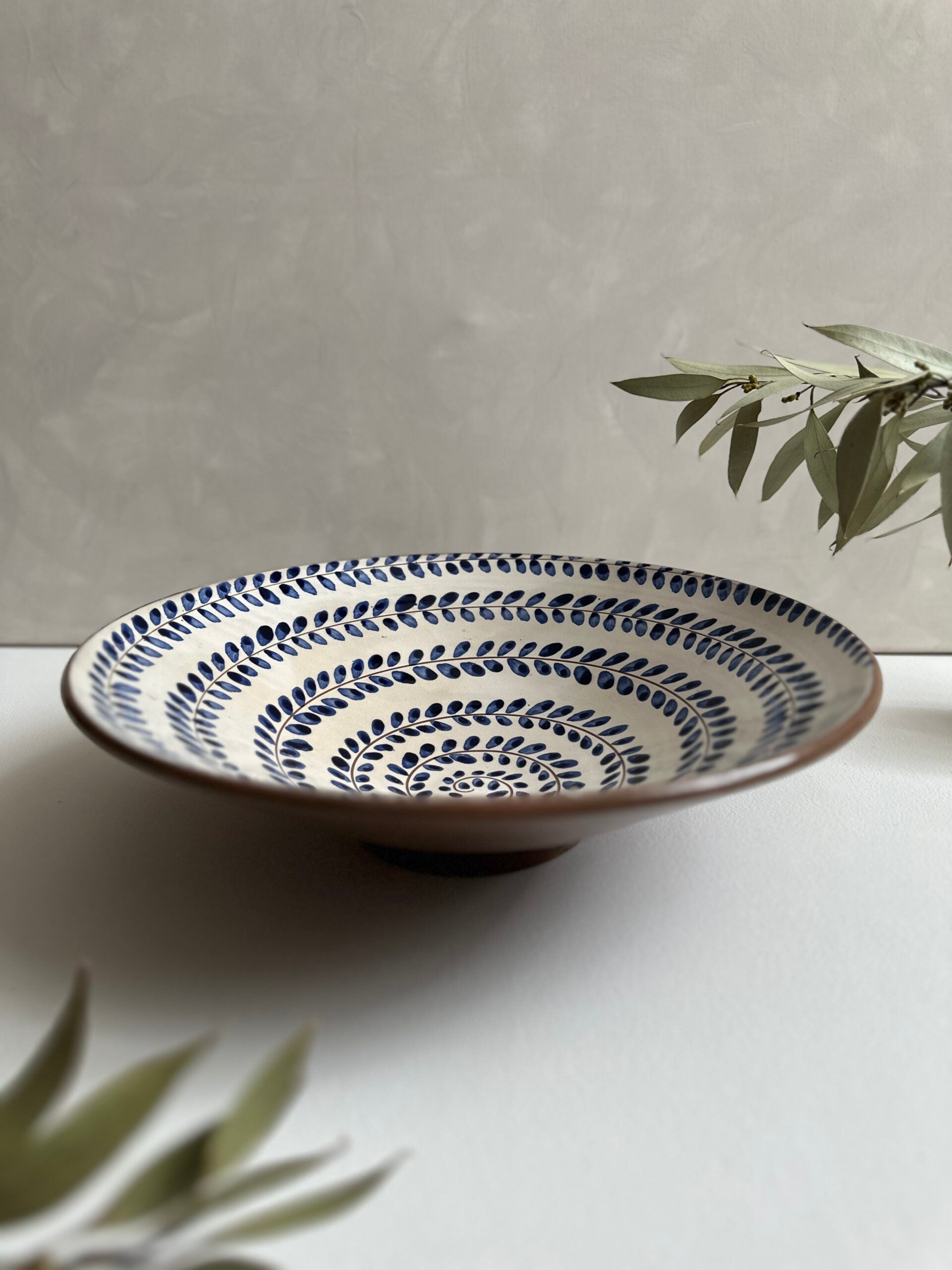 This collection is handmade by one of the talented artisans from Fayoum. The design beautifully captures the serene oasis environment in which it is made. Our Blue Swirl big bowl is a centrepiece for your table. It can be used to serve food – or use it as a bowl to store your fresh fruit. To ensure the longevity and beauty of your bowls, we recommend handwashing your bowls with mild soap and warm water. Avoid using abrasive materials or harsh chemicals, as they may damage the surface and finish. Our bowls are not microwave-safe. Please refrain from using them in the microwave to prevent any damage to the material or finish.Share