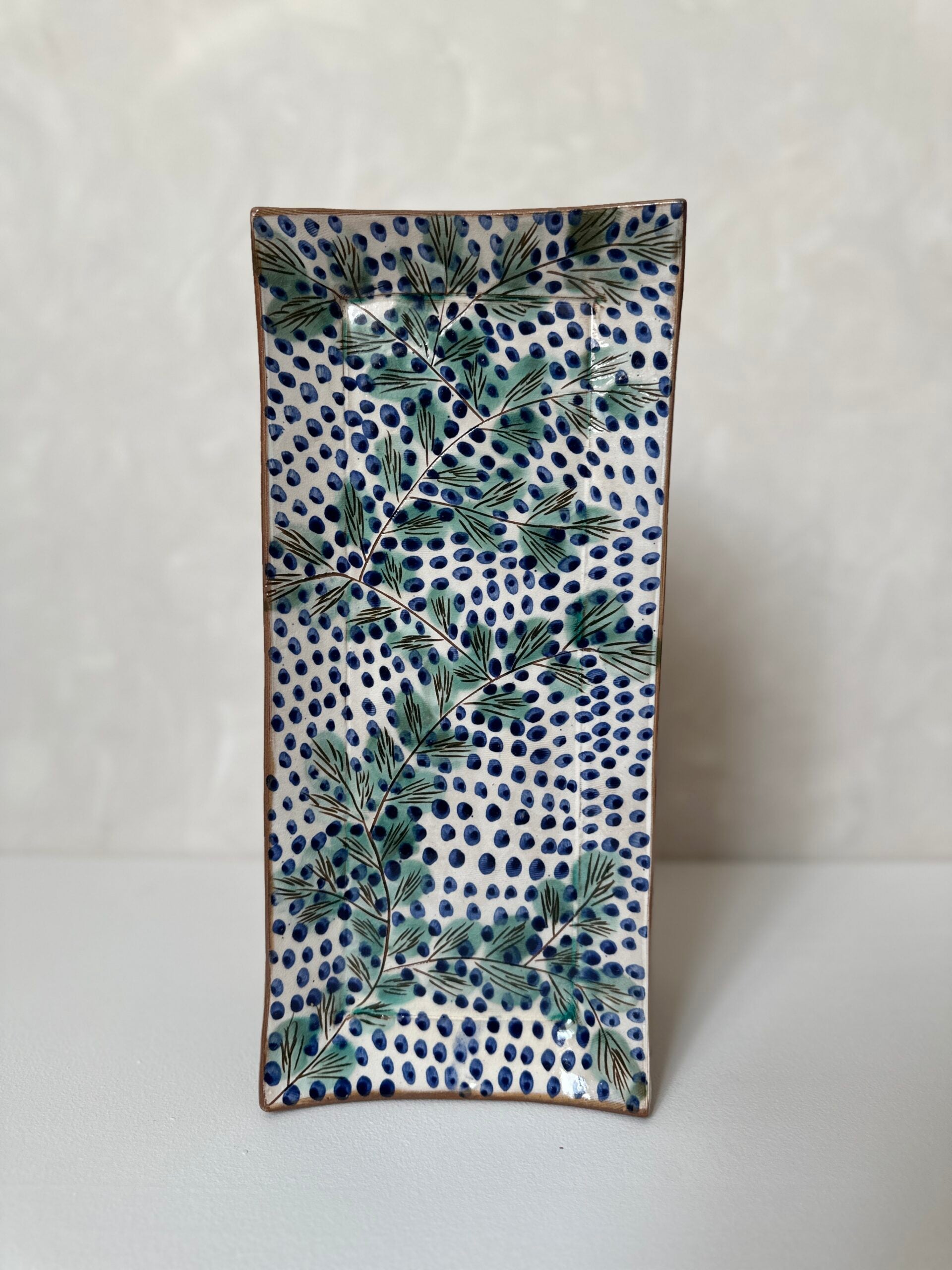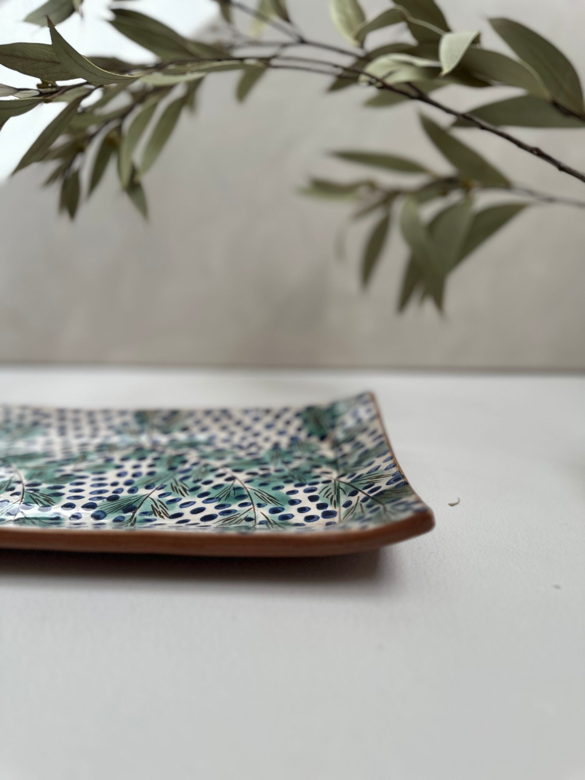 This collection is handmade by one of the talented artisans from Fayoum. The design beautifully captures the serene oasis environment in which it is made. Our long plate will bring a pop of colour to your table. This versatile piece is perfect for serving snacks to your guests - or as a beautiful decorative piece in your home. It can also be matched with our Fayoum cups. Be aware of small size differences and imperfections. Each piece is completely handmade and unique. To ensure the longevity and beauty of your bowls, we recommend handwashing your bowls with mild soap and warm water. Avoid using abrasive materials or harsh chemicals, as they may damage the surface and finish. Our bowls are not microwave-safe. Please refrain from using them in the microwave to prevent any damage to the material or finish.Share