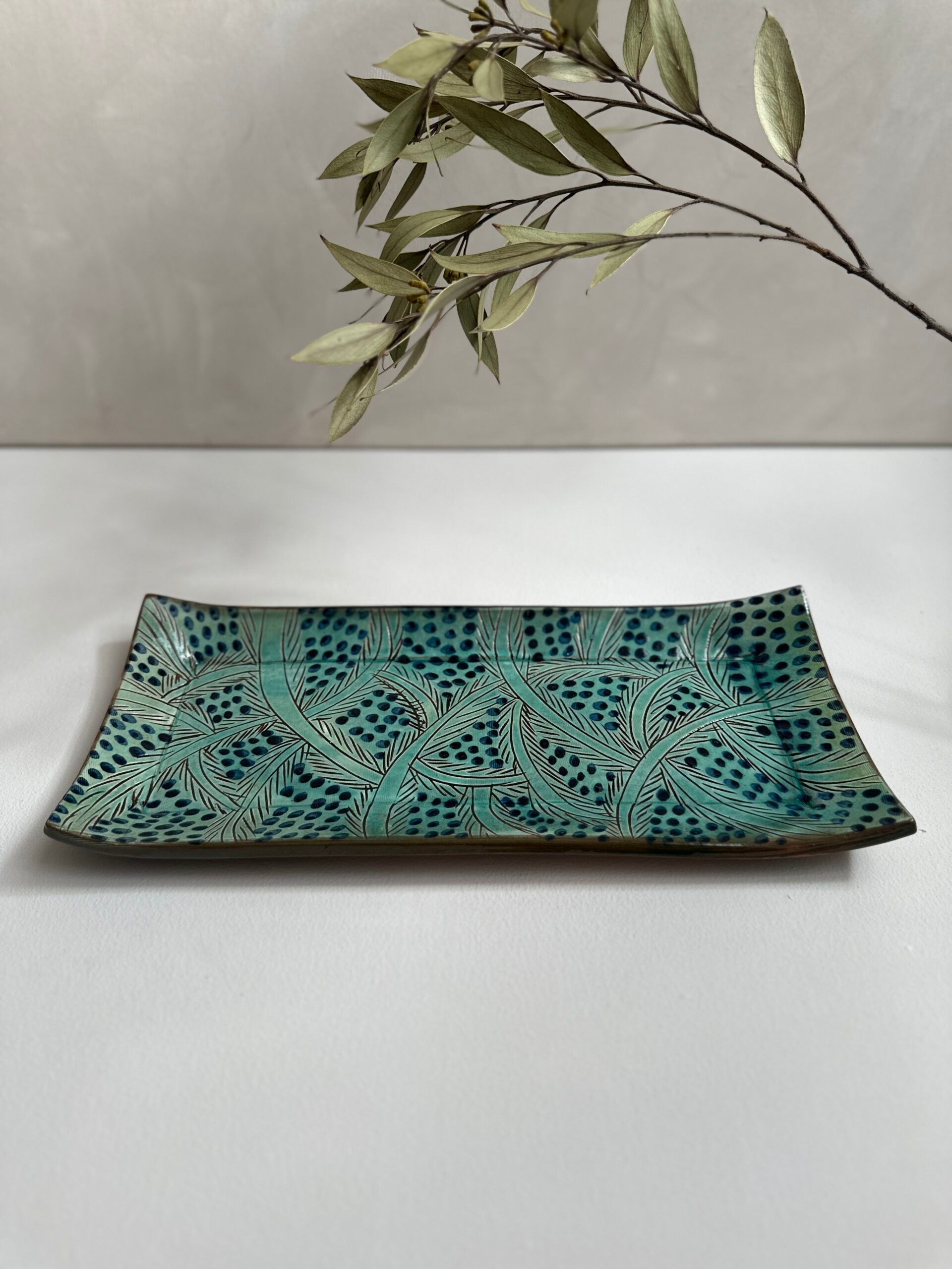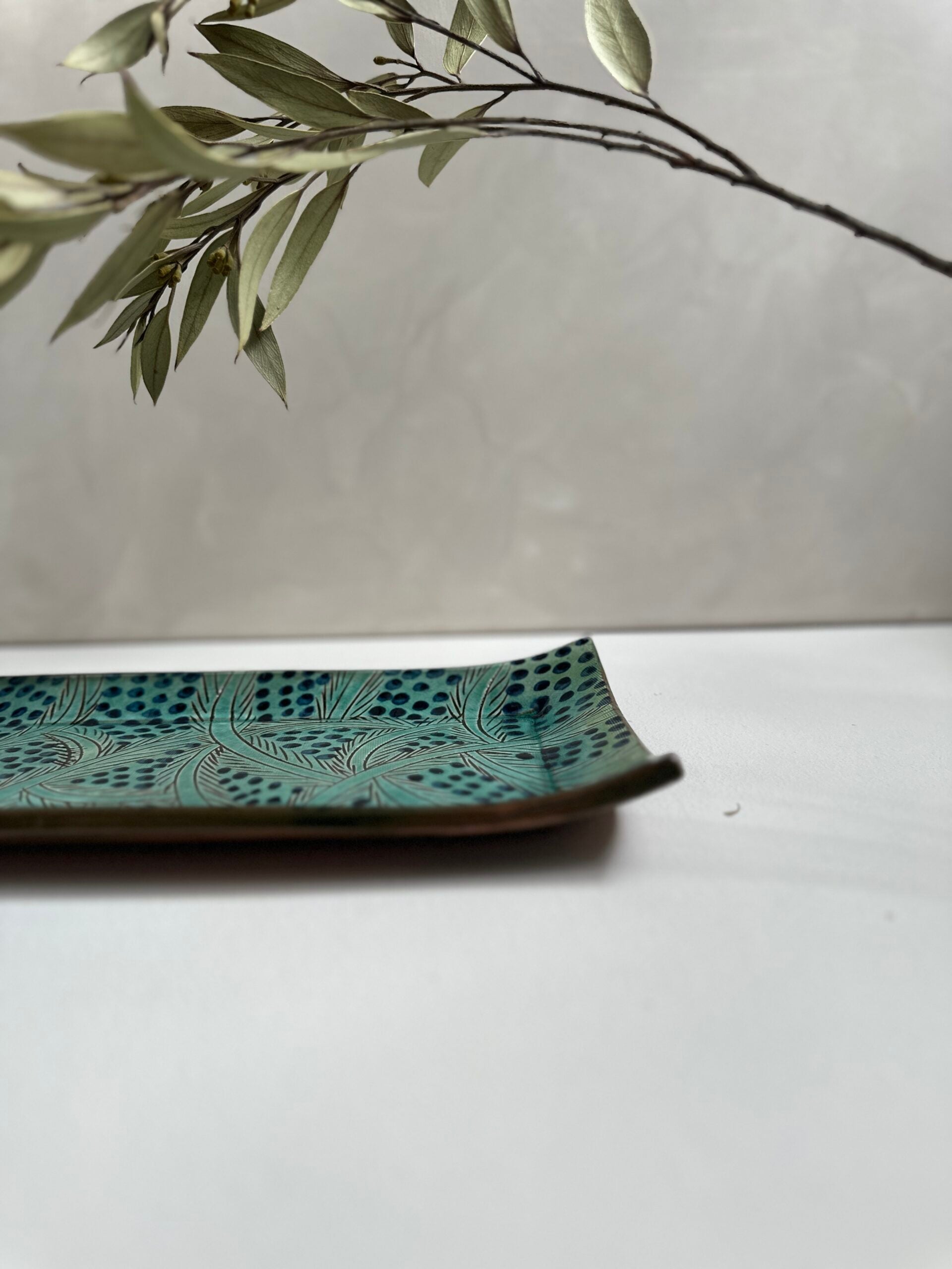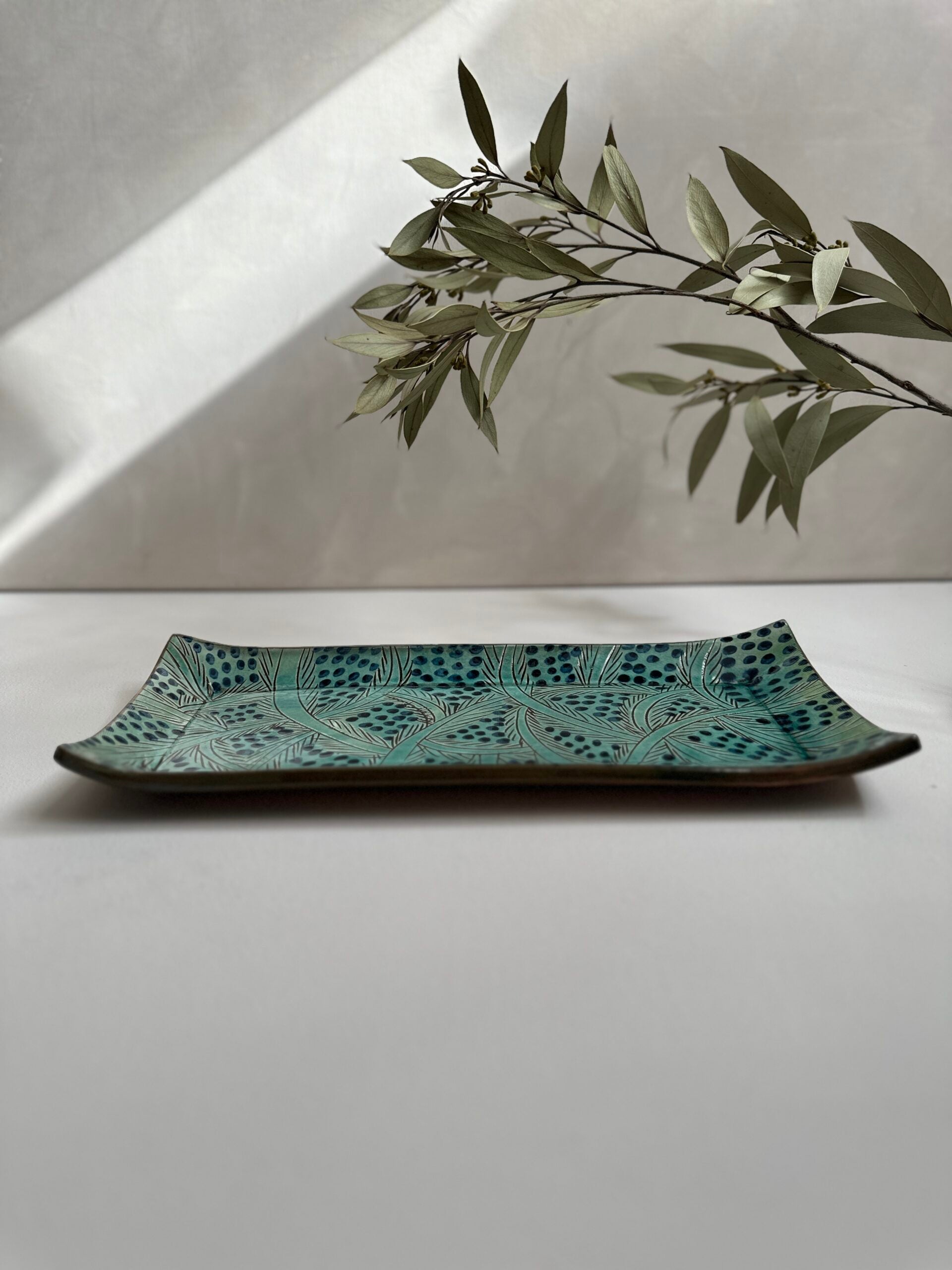 This collection is handmade by one of the talented artisans from Fayoum. The design beautifully captures the serene oasis environment in which it is made. Our long plate will bring a pop of colour to your table. This versatile piece is perfect for serving snacks to your guests - or as a beautiful decorative piece in your home. It can also be matched with our Fayoum cups. Be aware of small size differences and imperfections. Each piece is completely handmade and unique. To ensure the longevity and beauty of your bowls, we recommend handwashing your bowls with mild soap and warm water. Avoid using abrasive materials or harsh chemicals, as they may damage the surface and finish. Our bowls are not microwave-safe. Please refrain from using them in the microwave to prevent any damage to the material or finish.Share