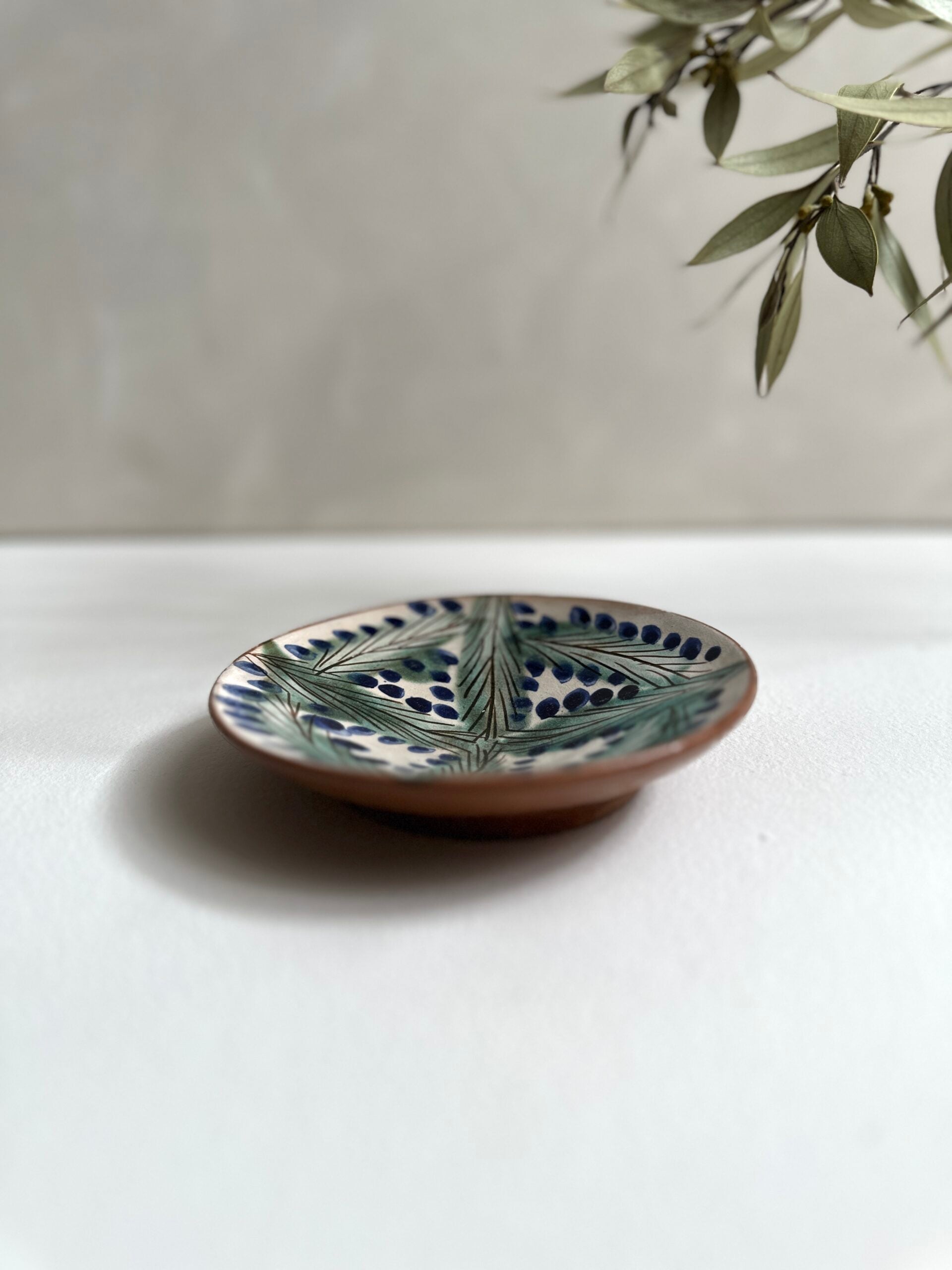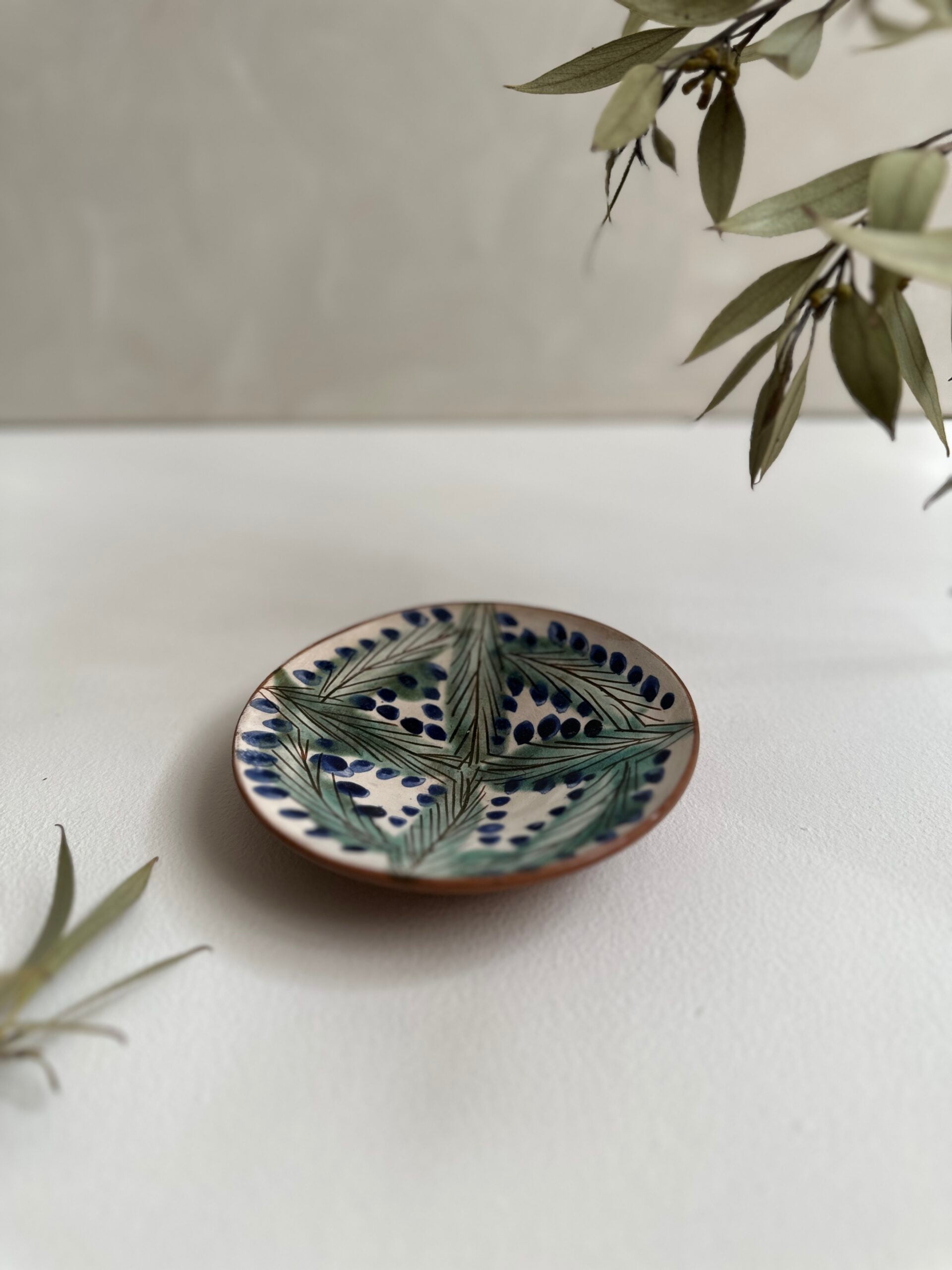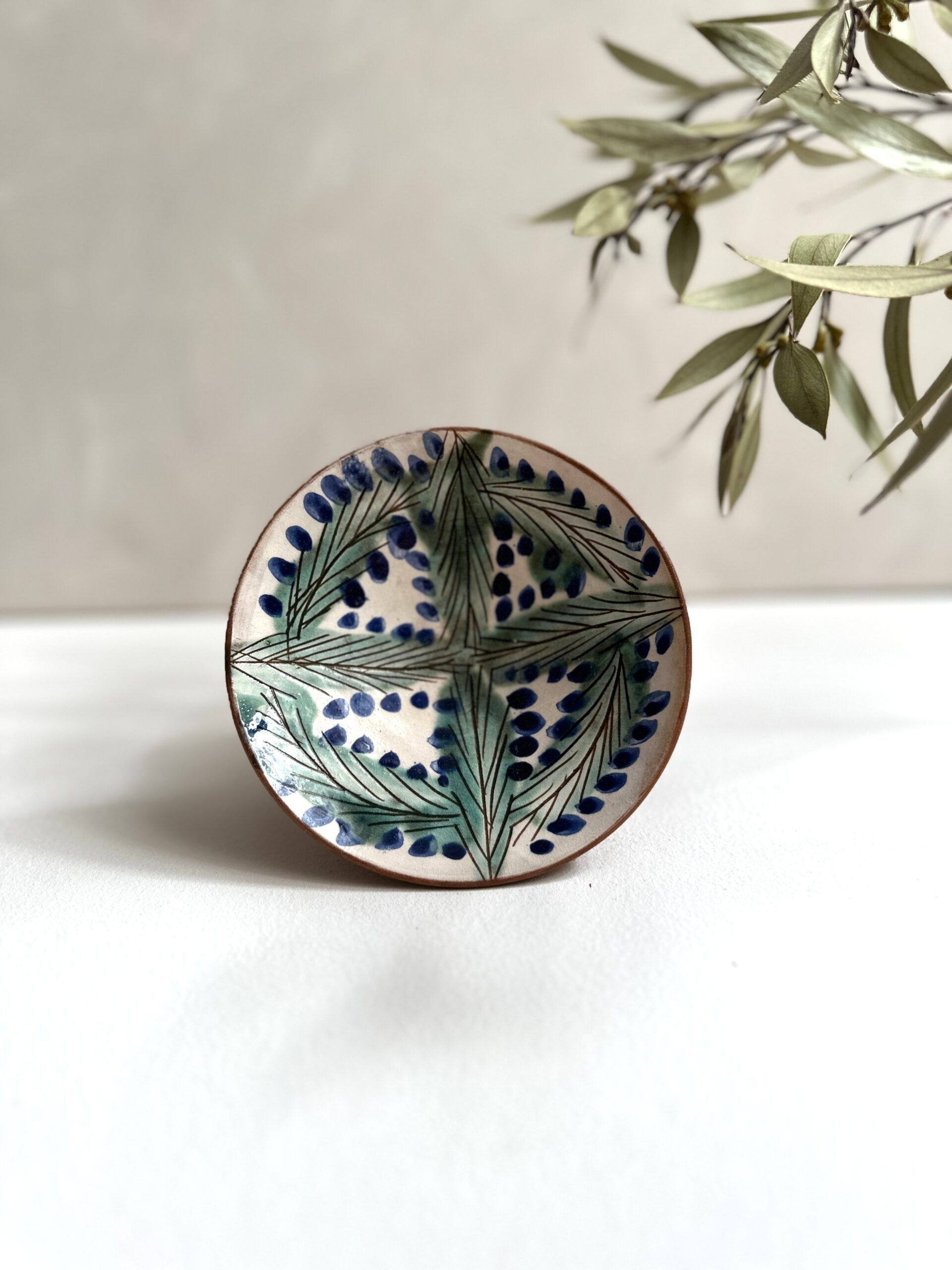 This collection is handmade by one of the talented artisans from Fayoum. The design beautifully captures the serene oasis environment in which it is made. Our small bowl is perfect for serving olives and sauces but also can be used for storing jewellery. To ensure the longevity and beauty of your bowls, we recommend handwashing your bowls with mild soap and warm water. Avoid using abrasive materials or harsh chemicals, as they may damage the surface and finish. Our bowls are not microwave-safe. Please refrain from using them in the microwave to prevent any damage to the material or finish.Share